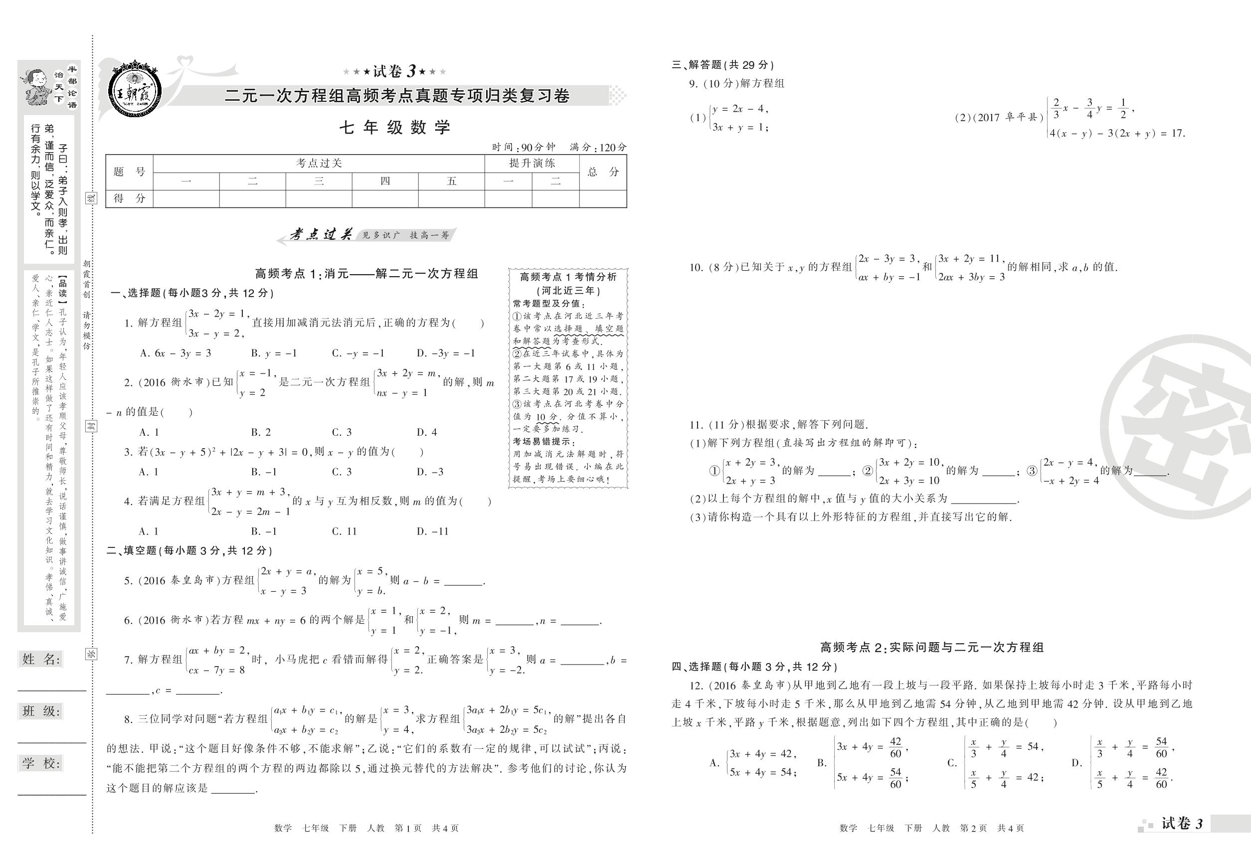 王朝霞期末专项卷——二元一次方程组高频考点真题专项归类复习卷七年级下册数学(人教版)【3】