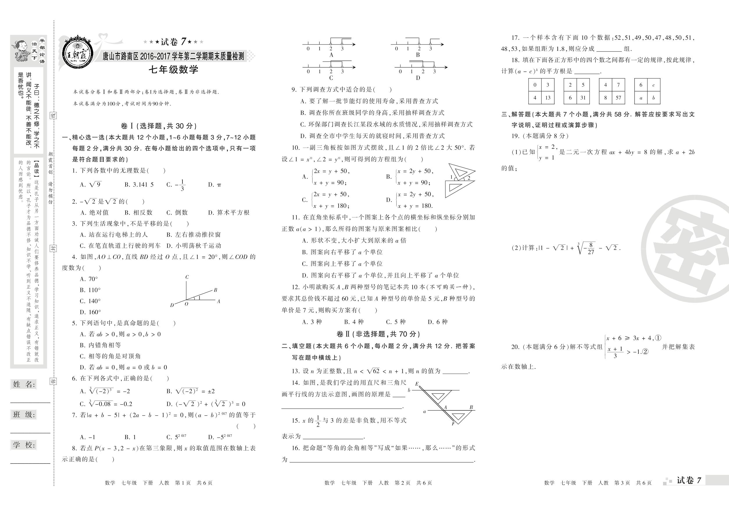 2016-2017学年第二学期唐山市路南区七年级数学试卷(人教版)【7】