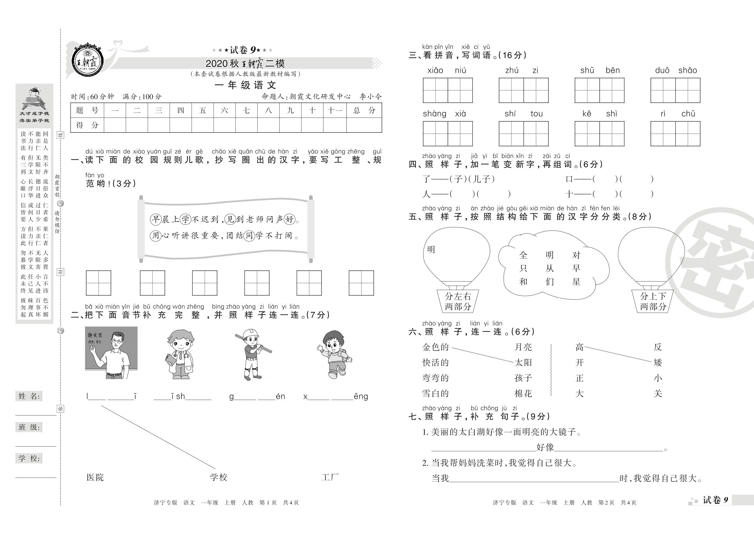 王朝霞期末模拟卷一年级上册语文(人教版)_R210731174501【9】