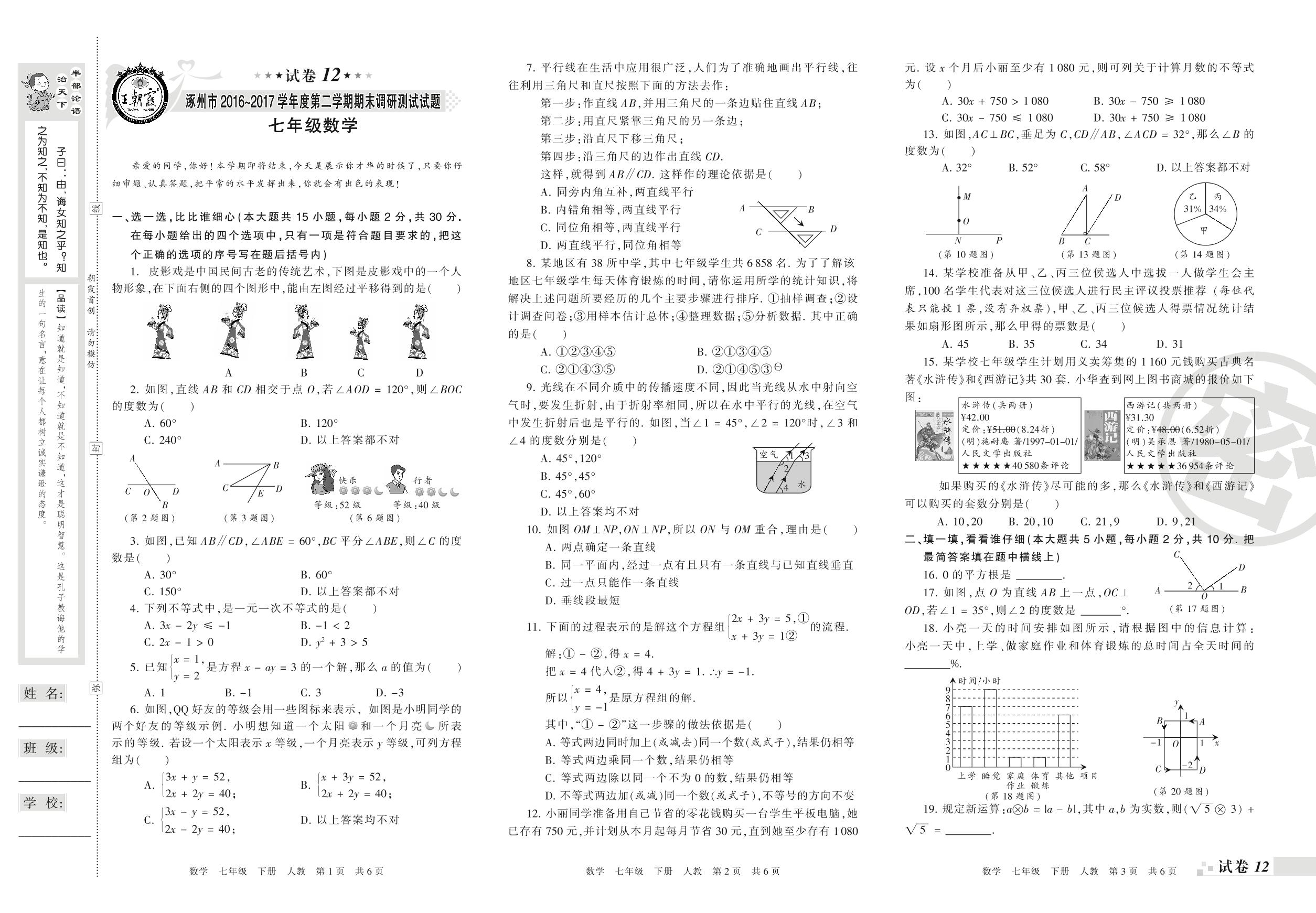 2016-2017学年第二学期涿州市七年级数学试卷(人教版)【12】