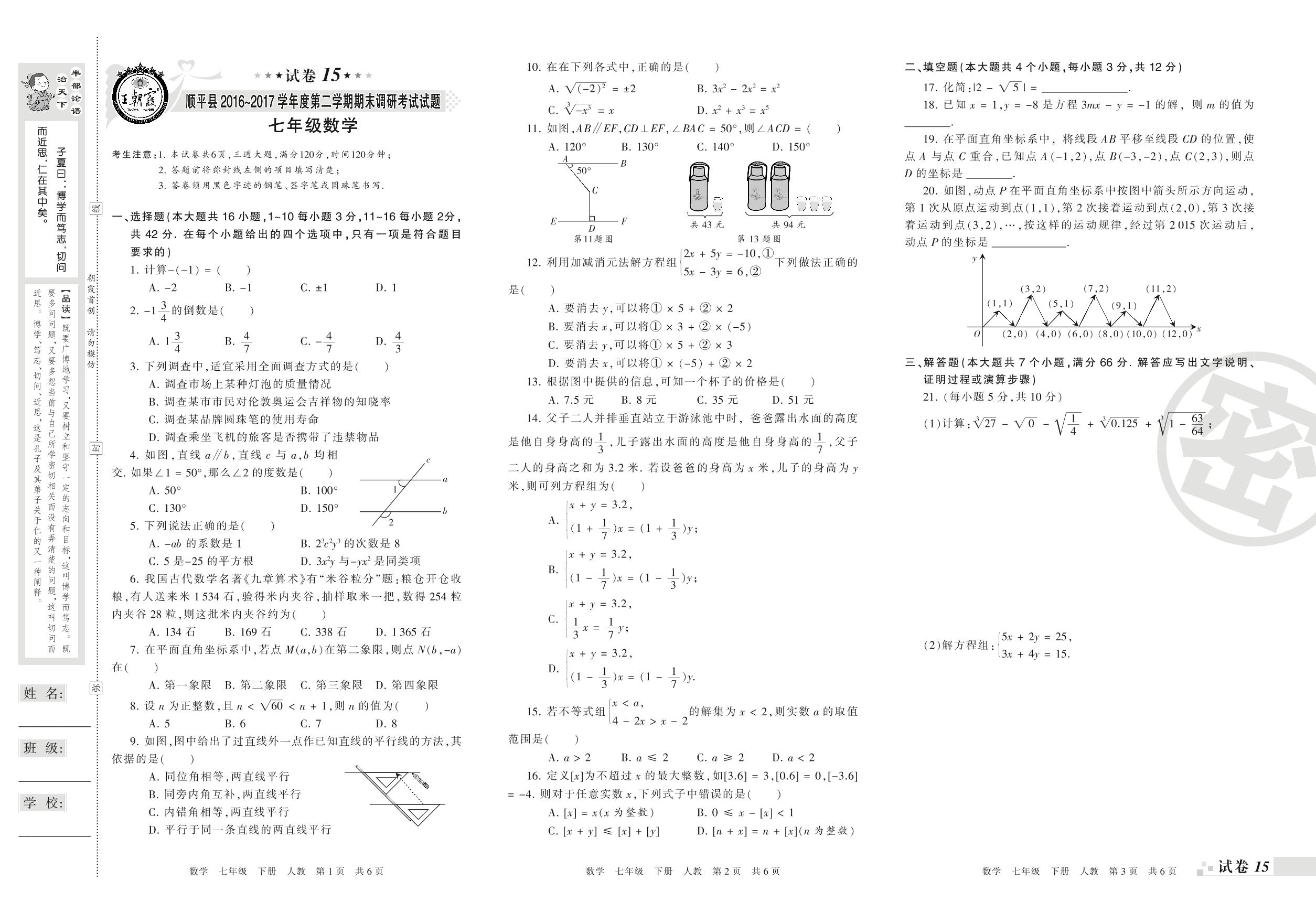 2016-2017学年第二学期保定市顺平县七年级数学试卷(人教版)【15】