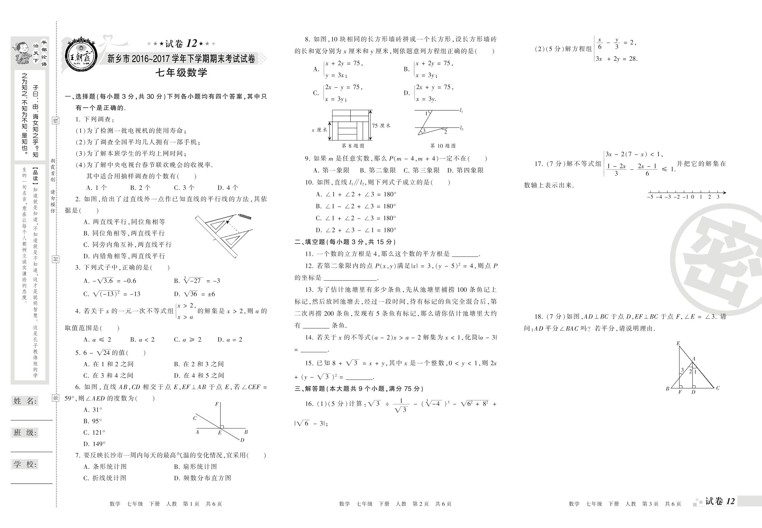 2016-2017学年第二学期新乡市七年级数学试卷(人教版)【12】