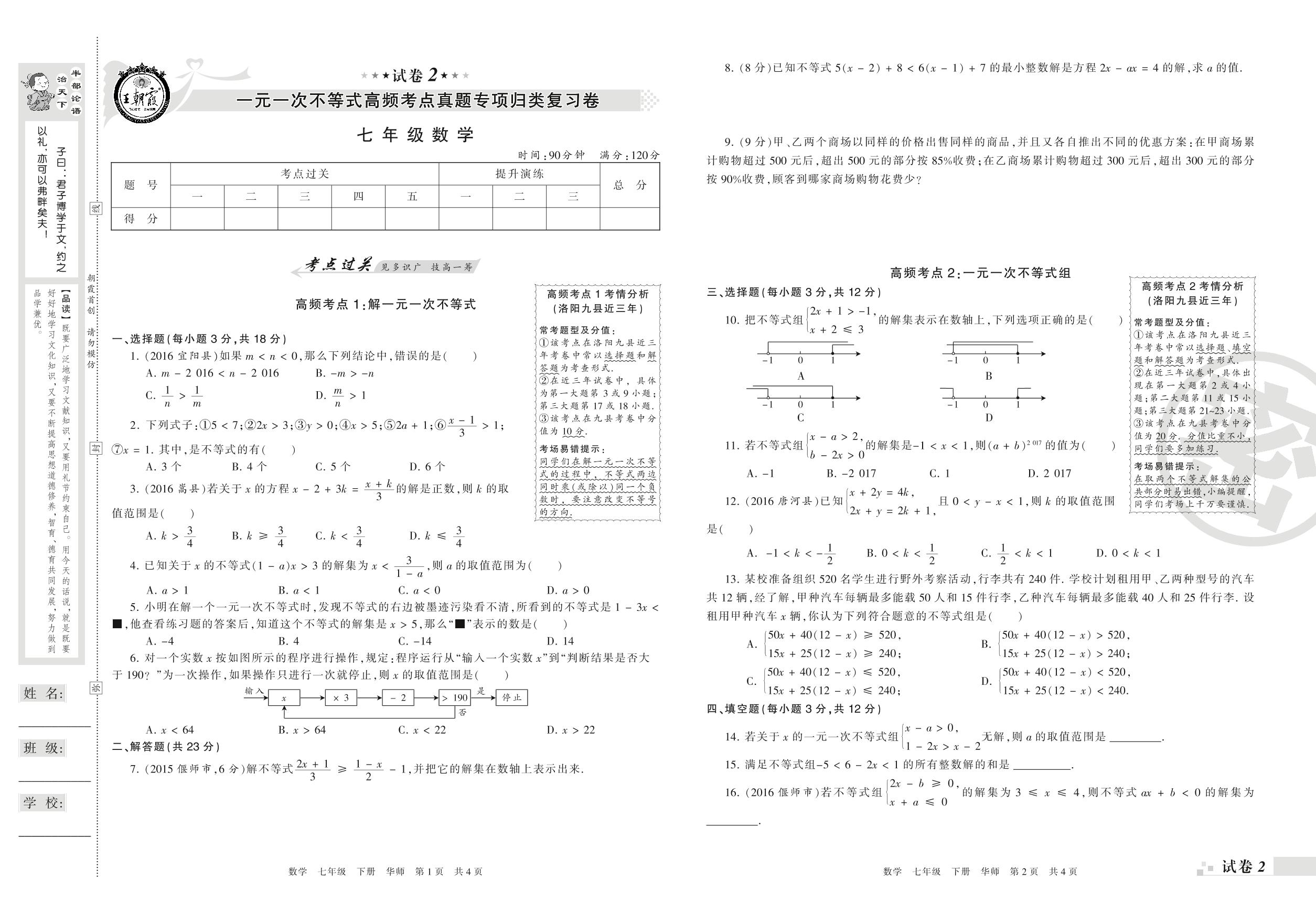 王朝霞期末专项卷——一元一次不等式真题专项归类复习卷七年级下册数学(华师版)【2】