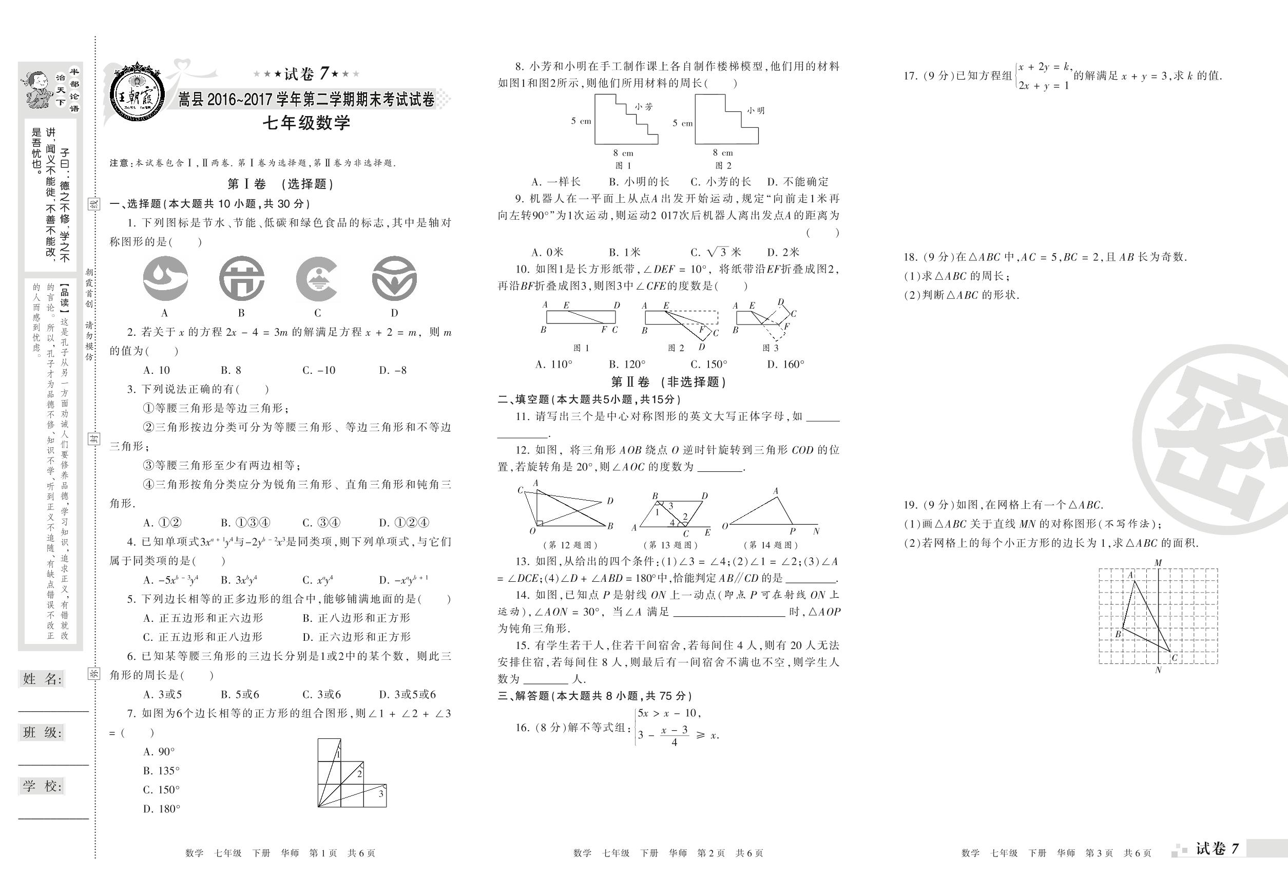 2016-2017学年第二学期洛阳市嵩县七年级数学试卷(华师版)【7】