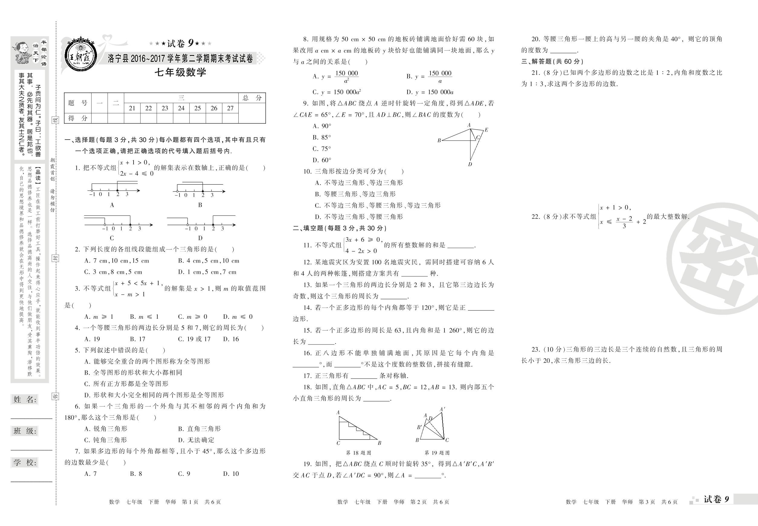 2016-2017学年第二学期洛阳市洛宁县七年级数学试卷(华师版)【9】