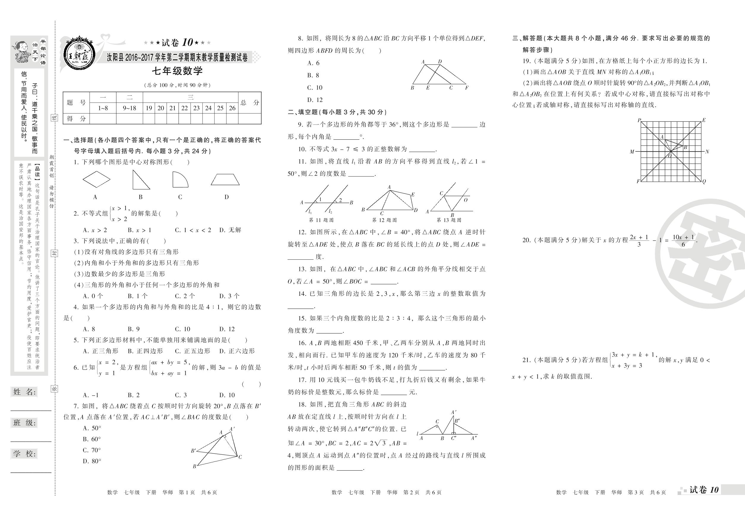 2016-2017学年第二学期洛阳市汝阳县七年级数学试卷(华师版)【10】