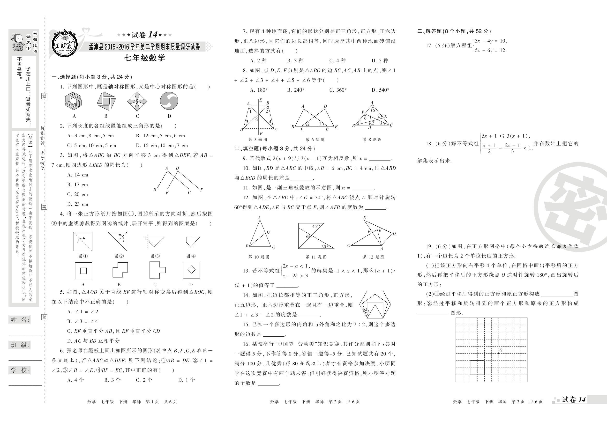 2015-2016学年第二学期洛阳市孟津县七年级数学试卷(华师版)【14】