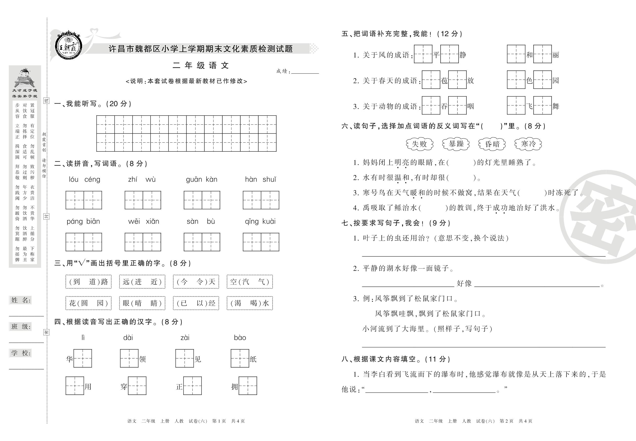2016-2017学年第一学期许昌市魏都区二年级语文试卷(人教版)【6】