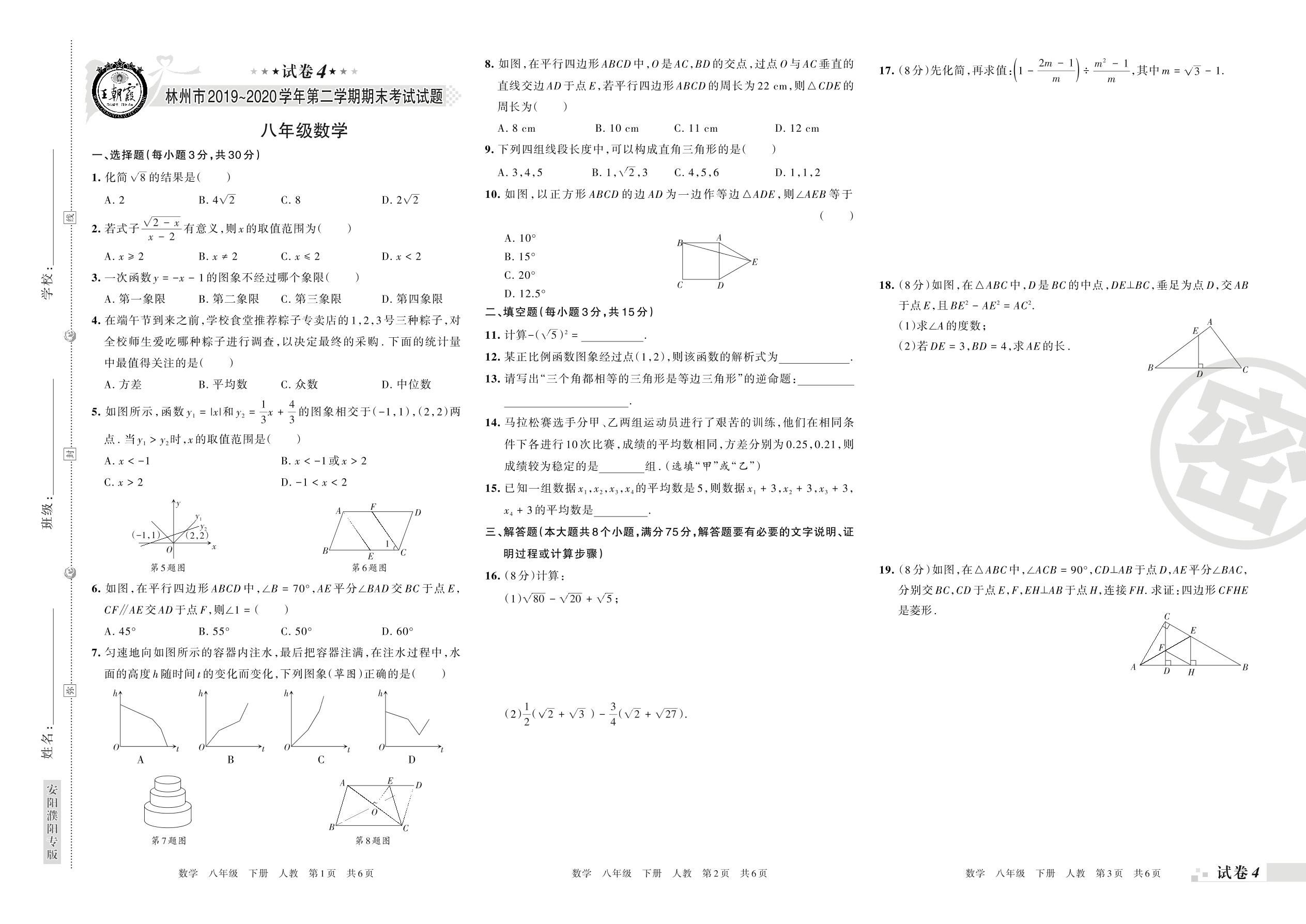 2019-2020学年第二学期林州市八年级数学试卷(人教版)【4】