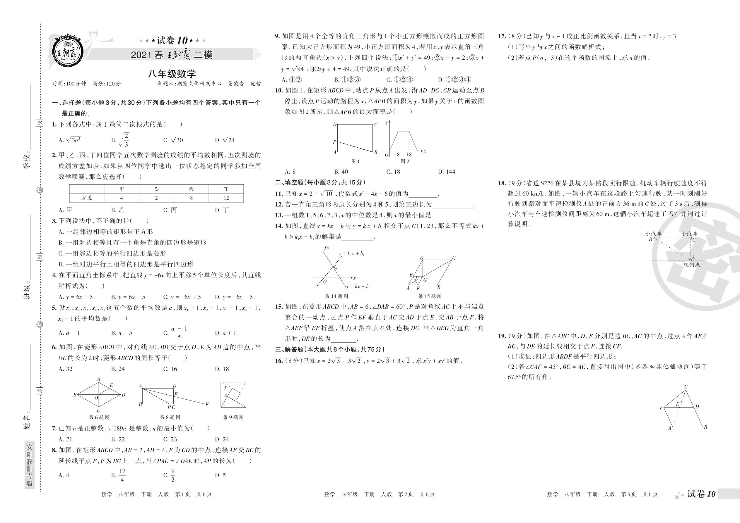 王朝霞期末模拟卷八年级下册数学(人教版)_R21080684735【10】