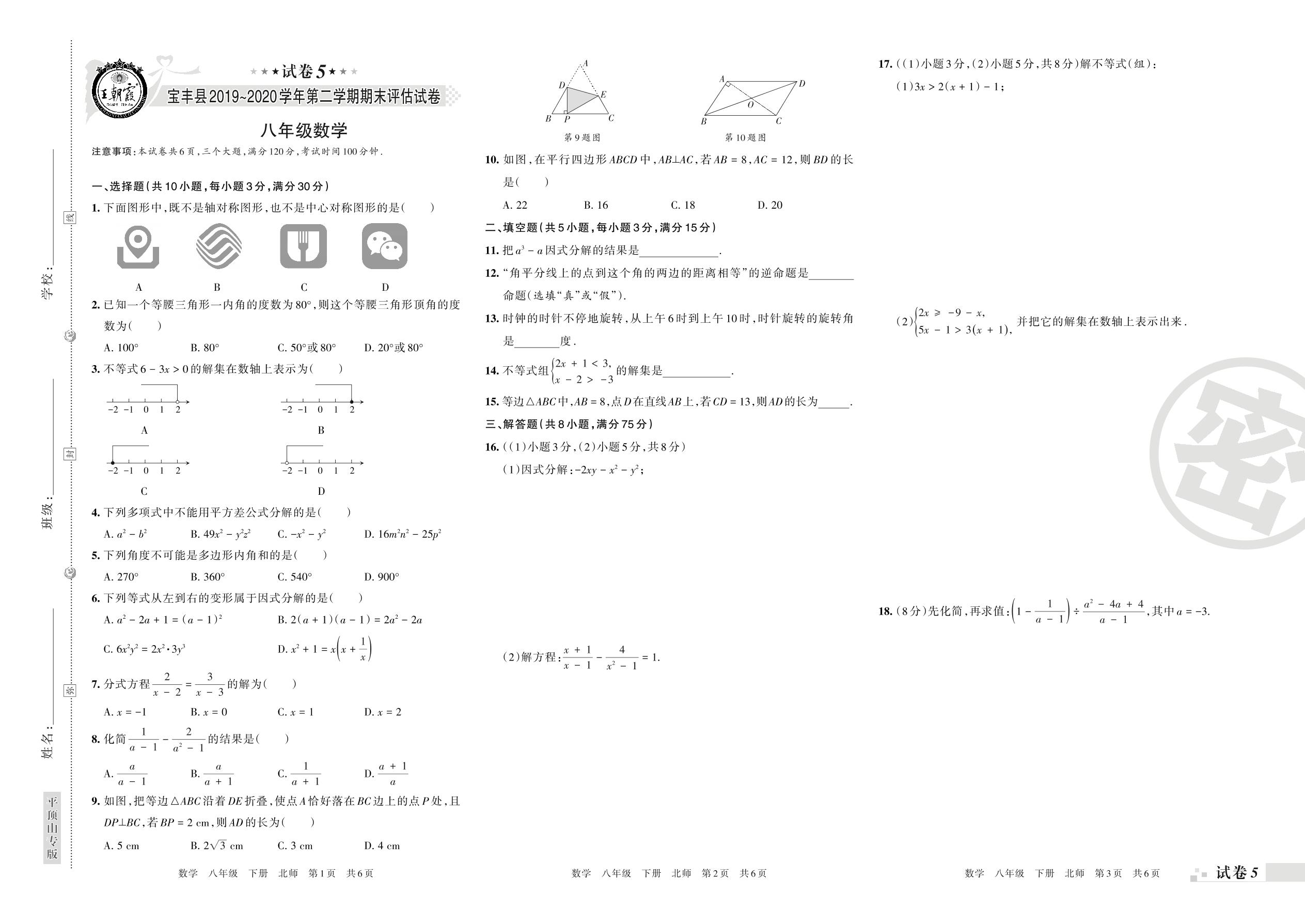 2019-2020学年第二学期平顶山市宝丰县八年级数学试卷(北师版)【5】
