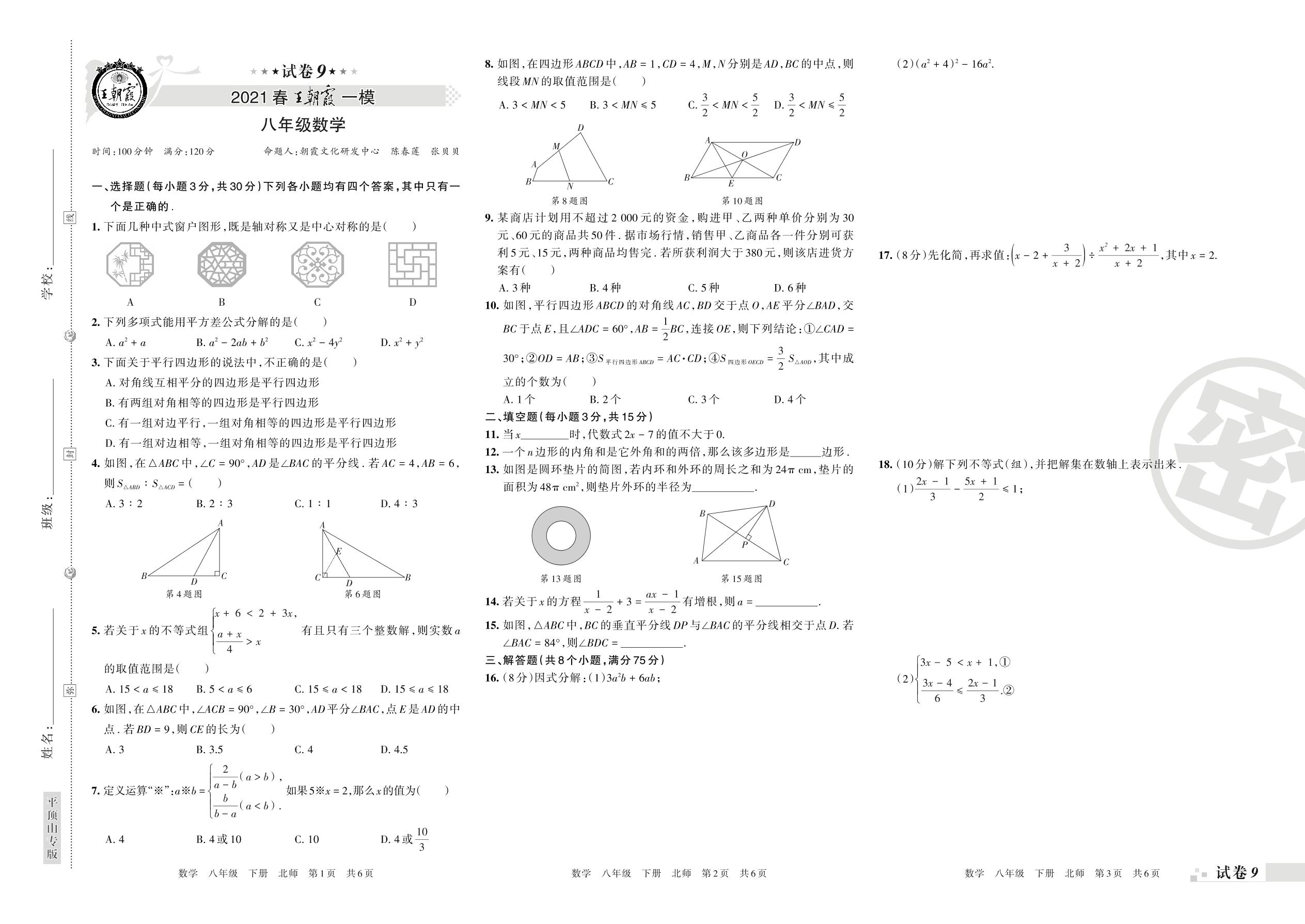 王朝霞期末模拟卷八年级下册数学(北师版)_R21080685008【9】