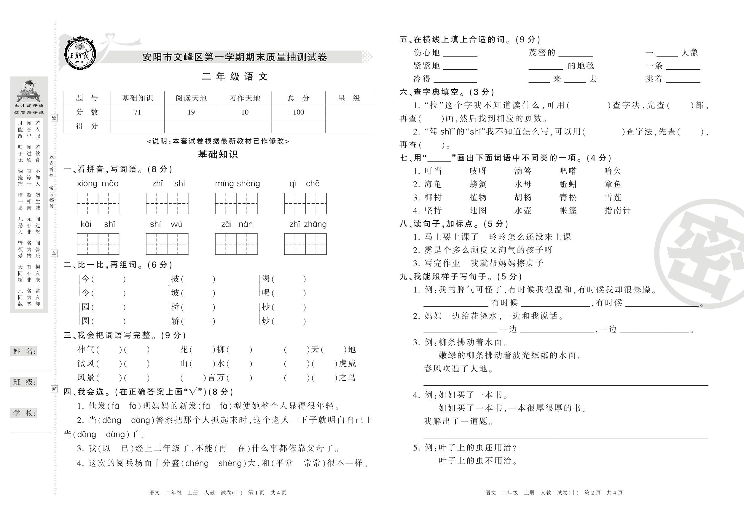 2016-2017学年第一学期安阳市文峰区二年级语文试卷(人教版)【10】