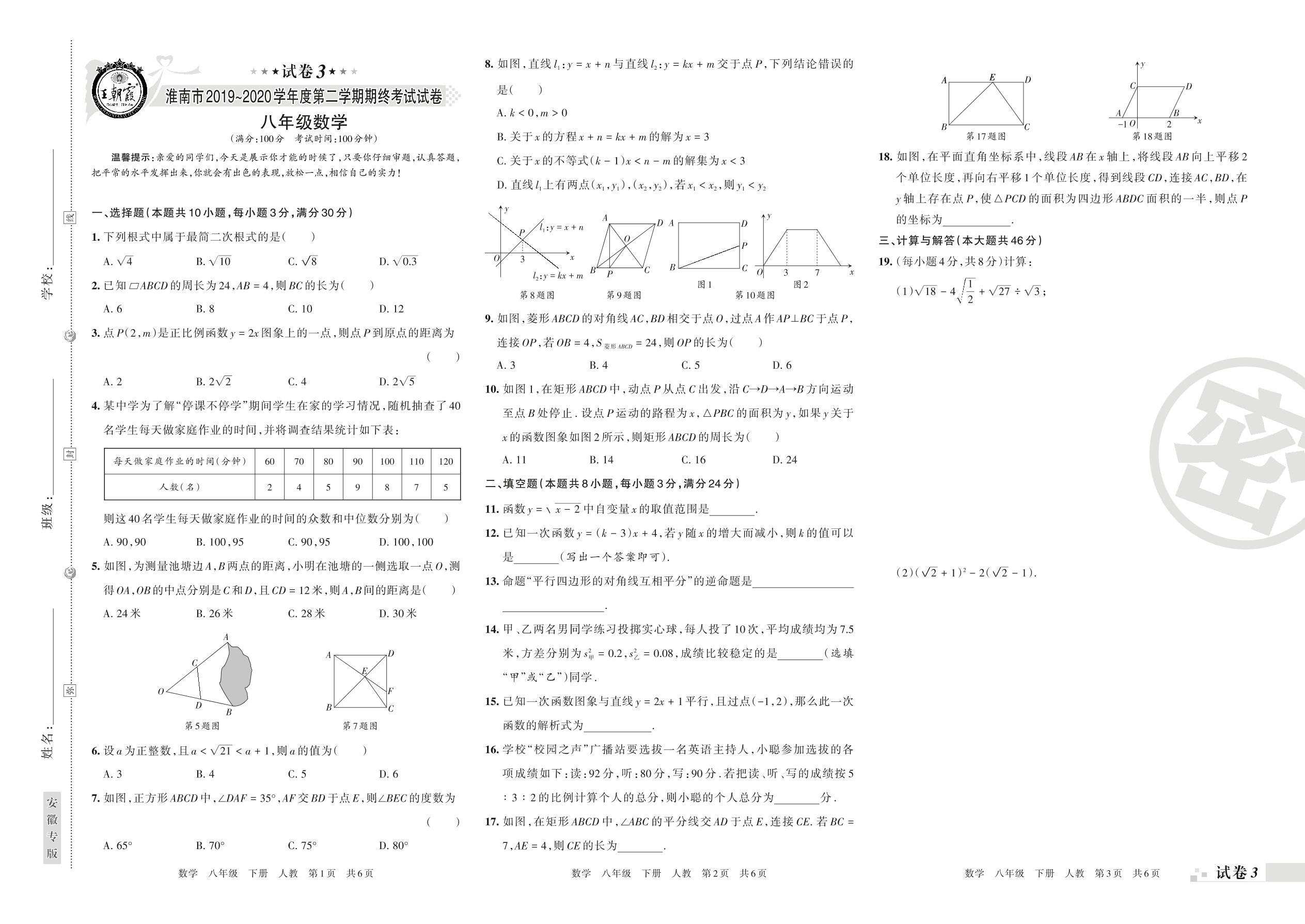2019-2020学年第二学期淮南市八年级数学试卷(人教版)【3】
