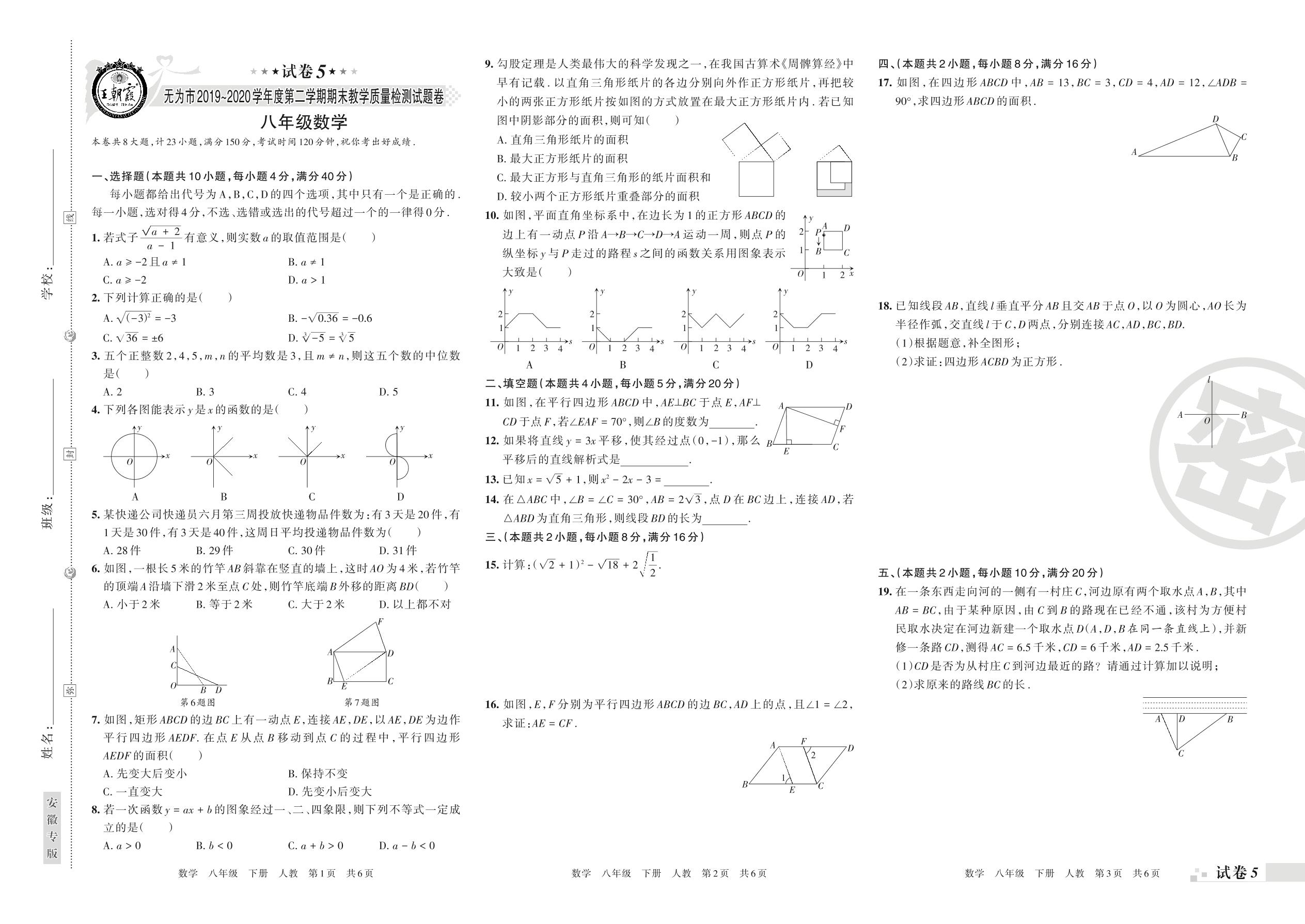 2019-2020学年第二学期无为市八年级数学试卷(人教版)【5】