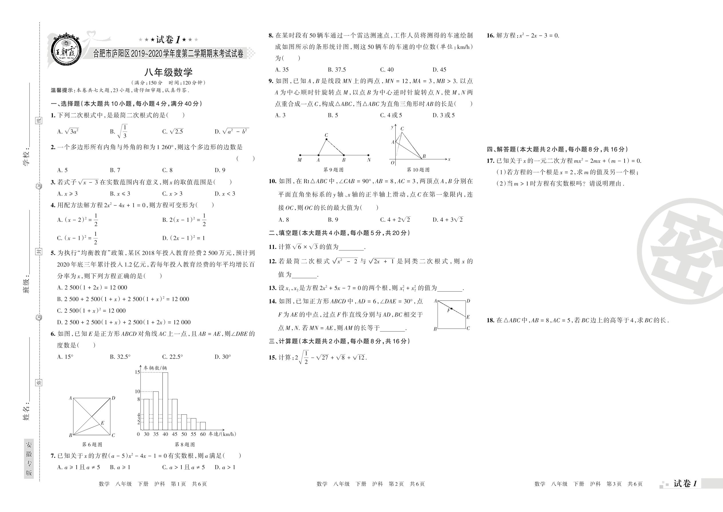 2019-2020学年第二学期合肥市庐阳区八年级数学试卷(沪科版)【1】