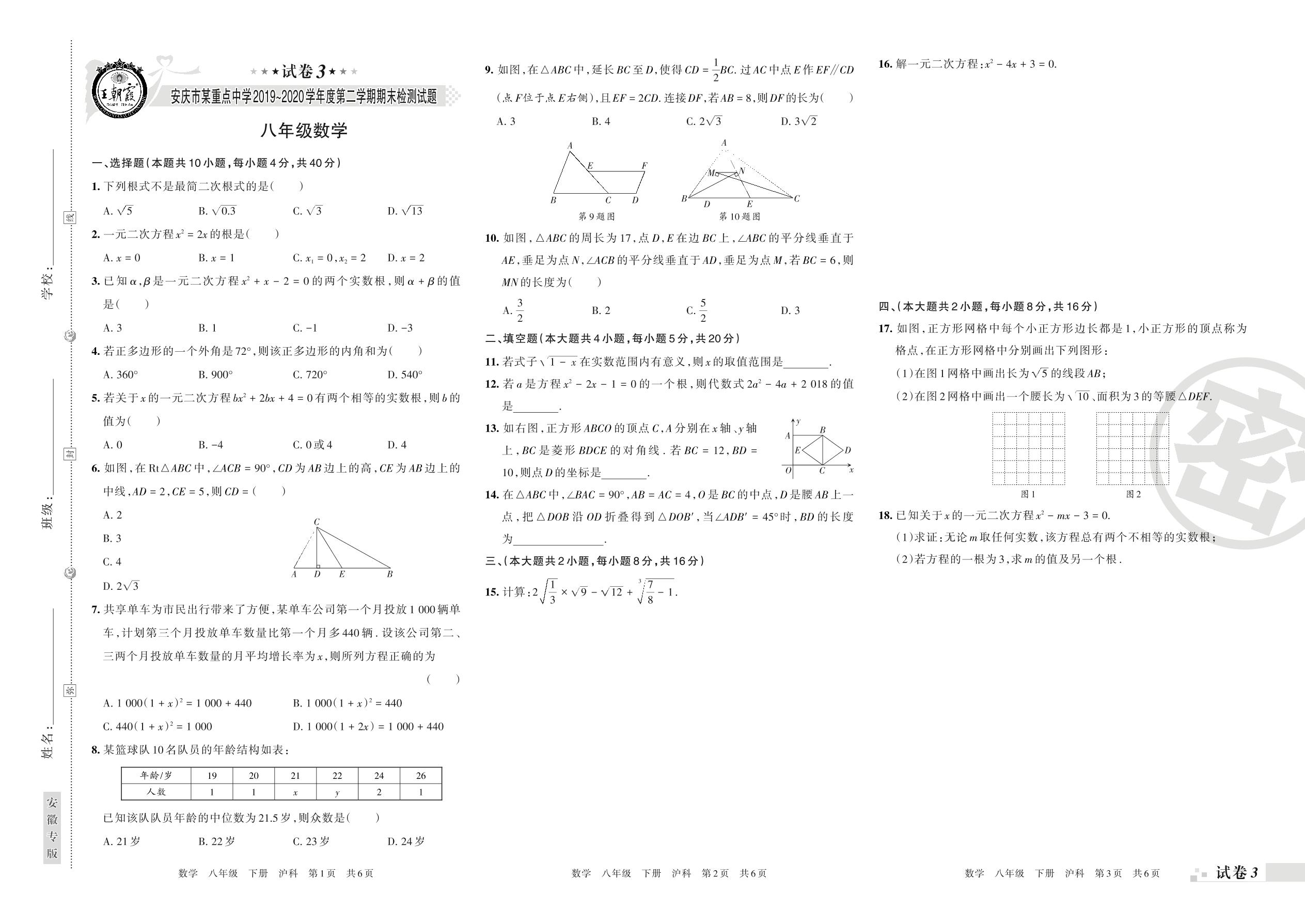 2019-2020学年第二学期安庆市某重点中学八年级数学试卷(沪科版)【3】