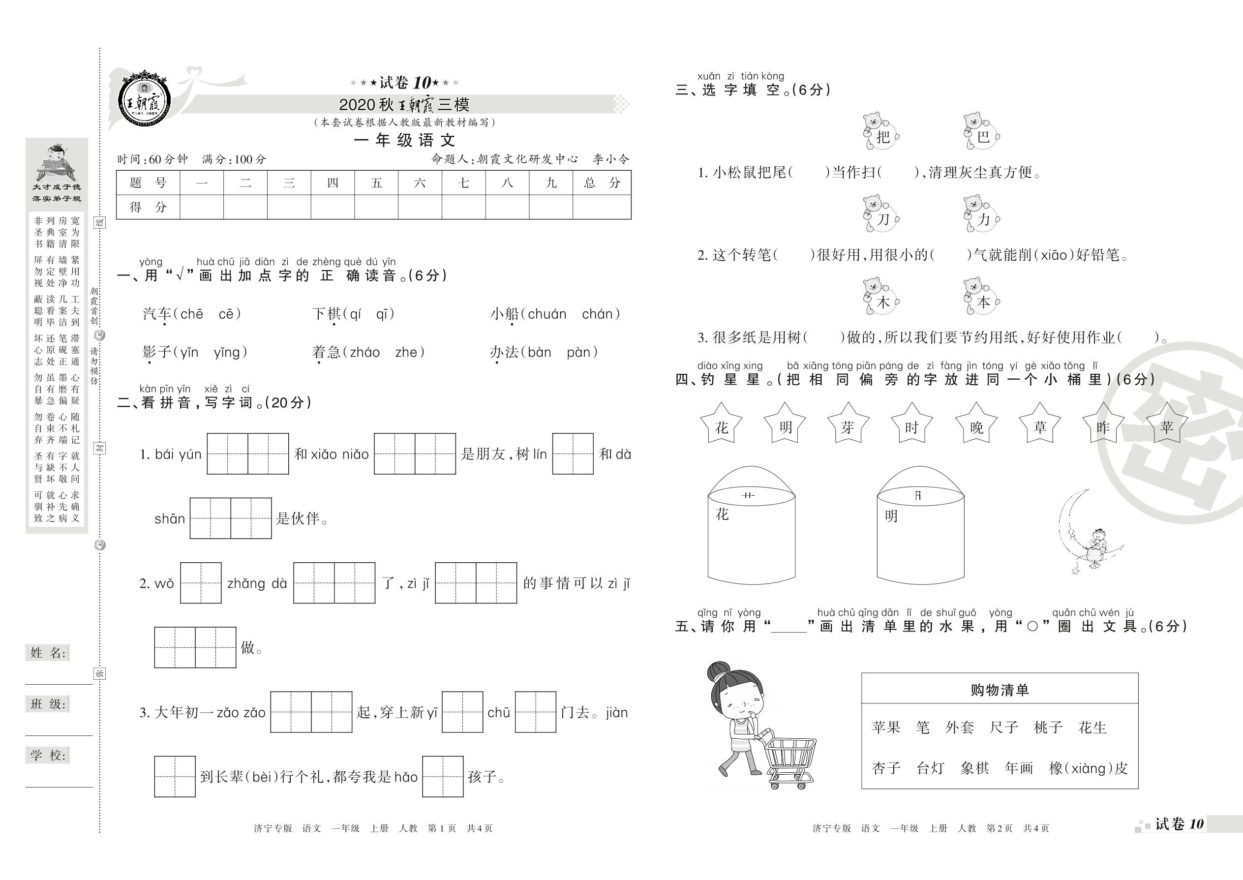 王朝霞期末模拟卷一年级上册语文(人教版)_R210731174515【10】