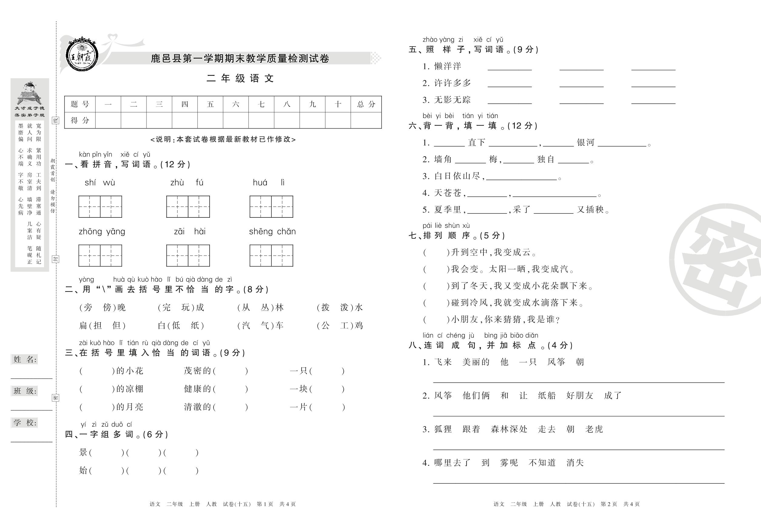 2016-2017学年第一学期周口市鹿邑县二年级语文试卷(人教版)【15】
