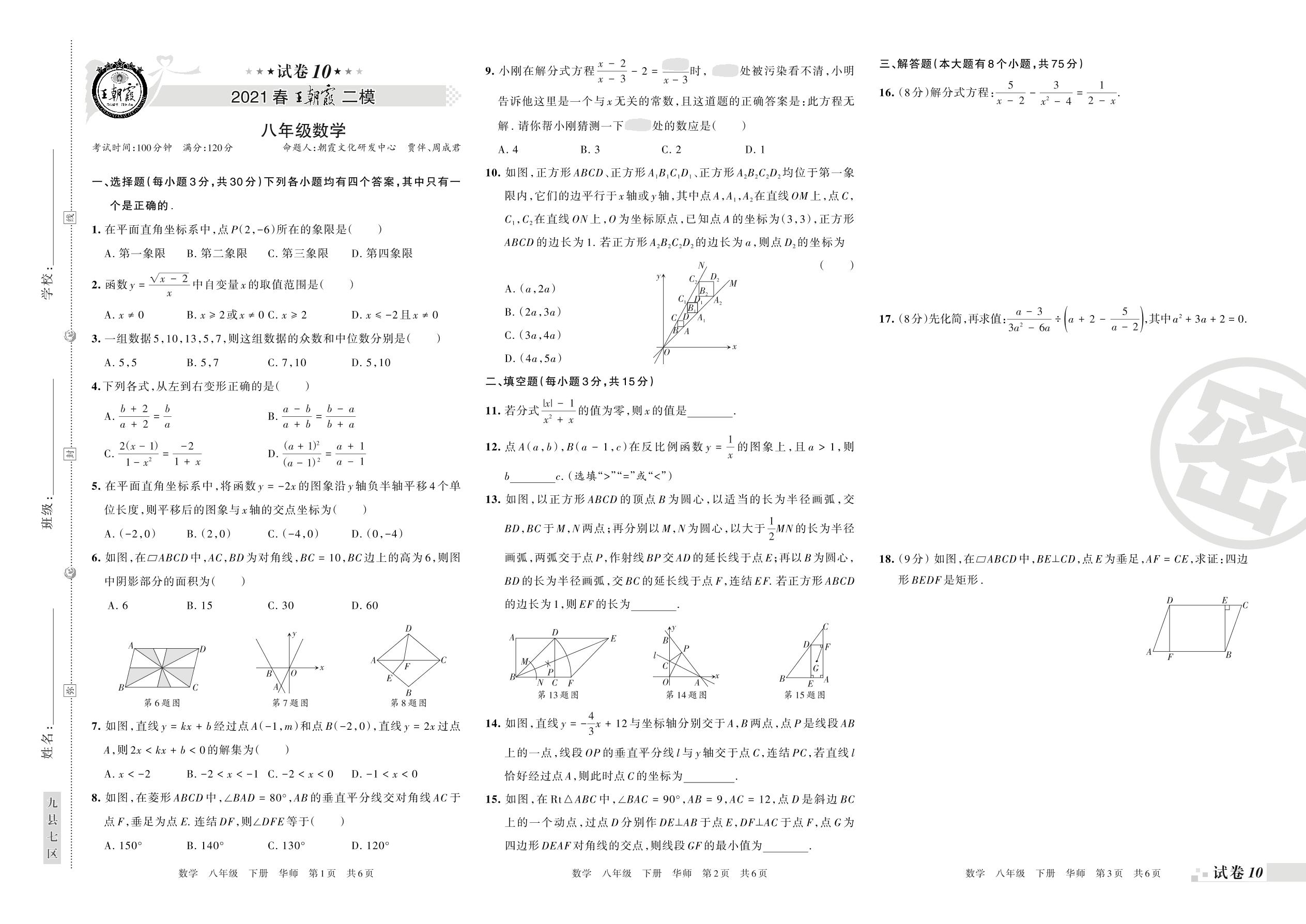 王朝霞期末模拟卷八年级下册数学(华师版)_R21080690007【10】