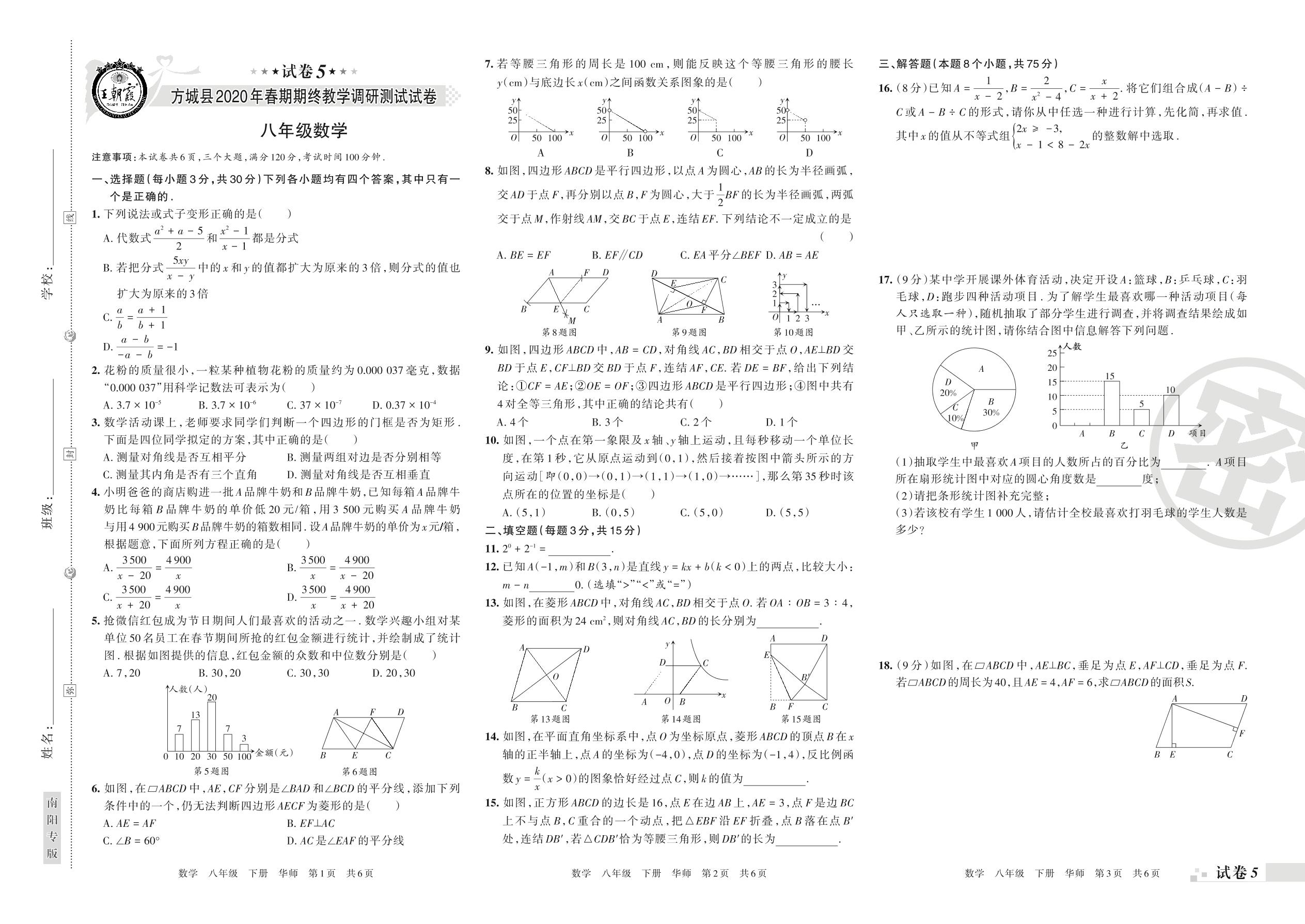 2019-2020学年第二学期南阳市方城县八年级数学试卷(华师版)【5】