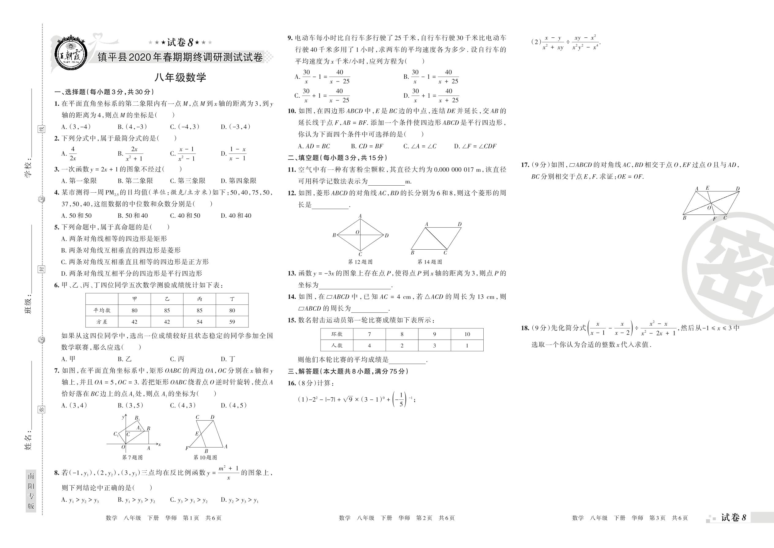 2019-2020学年第二学期南阳市镇平县八年级数学试卷(华师版)【8】