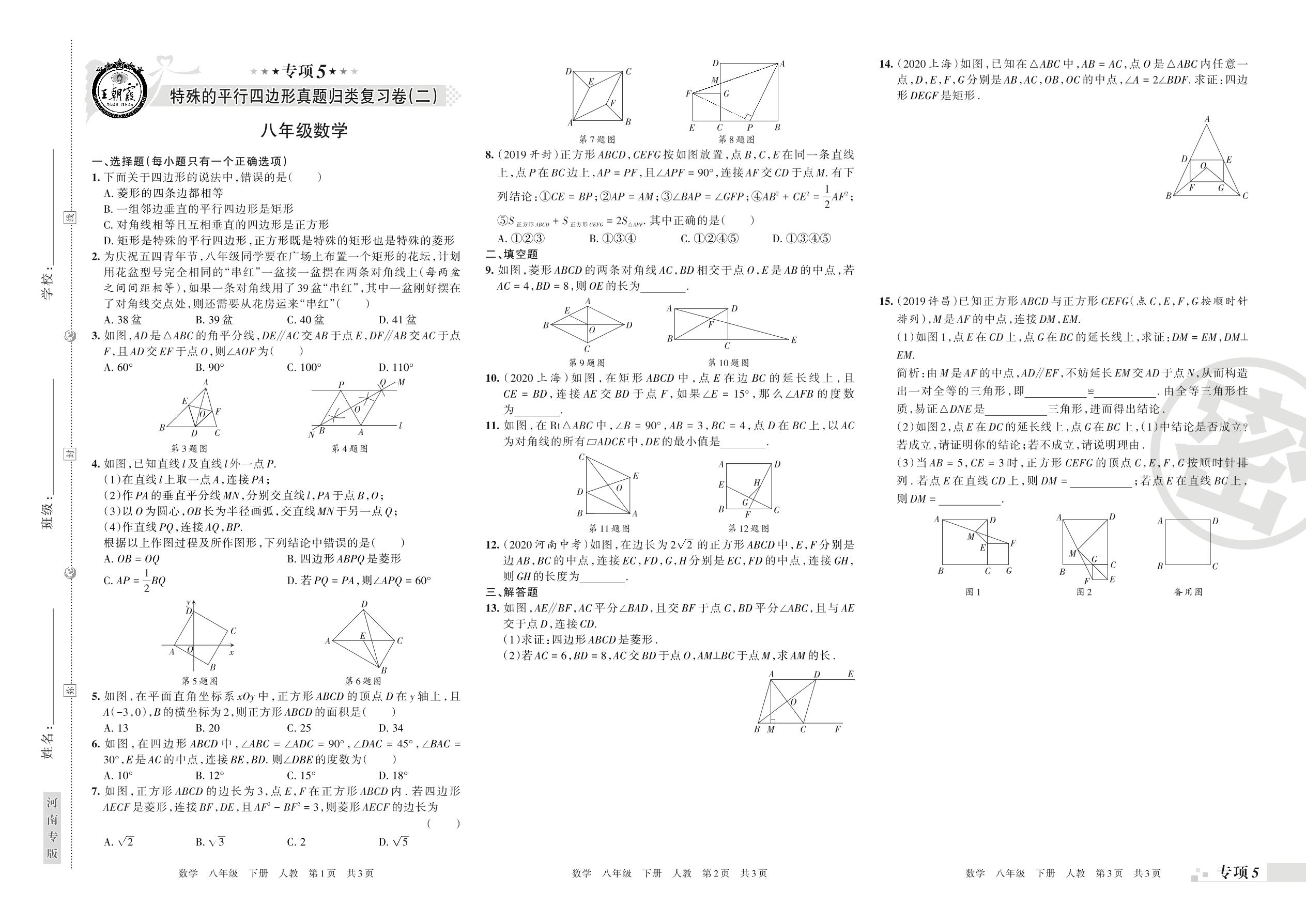 王朝霞期末专项卷——特殊的平行四边形、函数及一次函数的图象与性质八年级下册数学(人教版)【0】