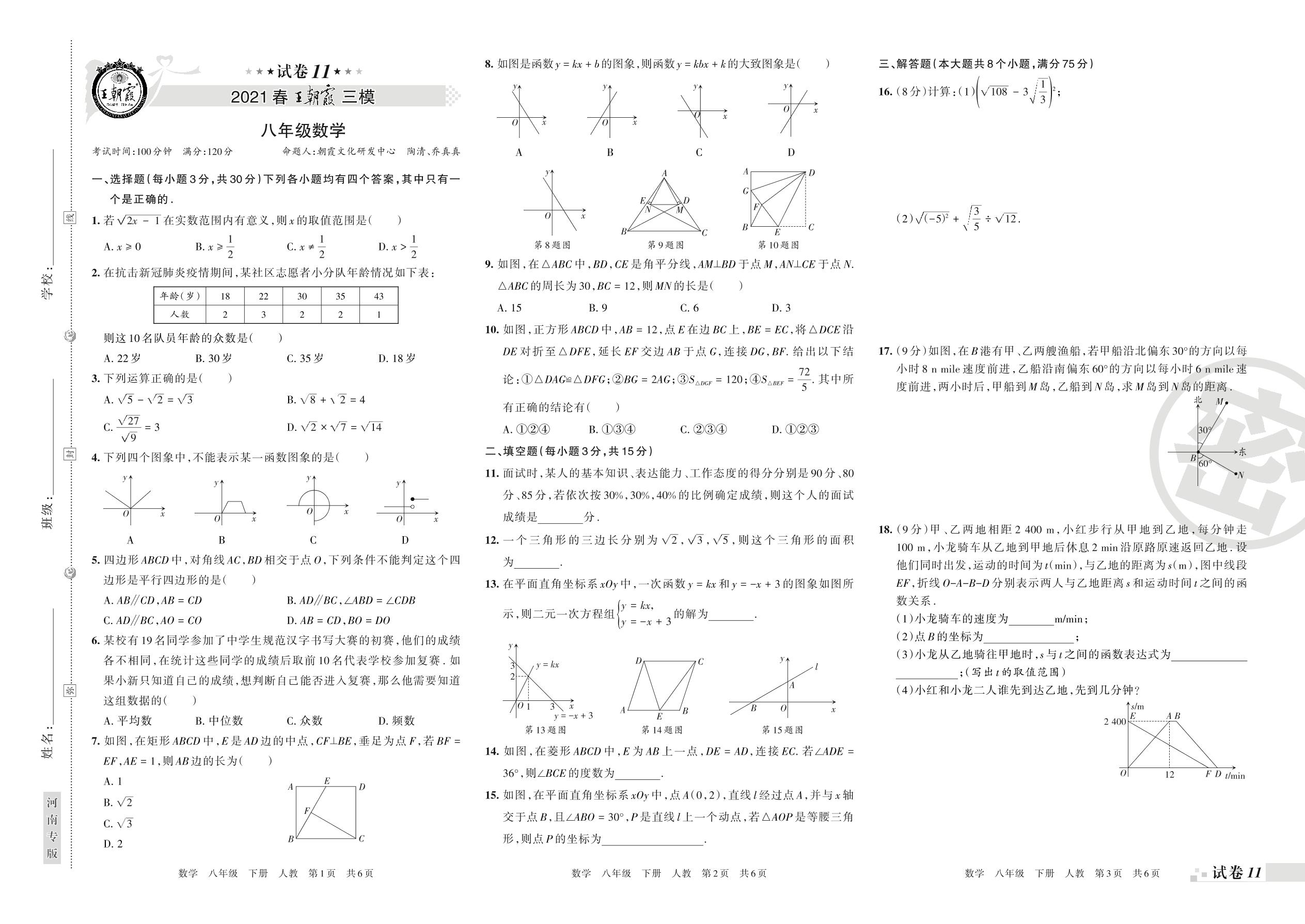 王朝霞期末模拟卷八年级下册数学(人教版)_R21080690401【11】