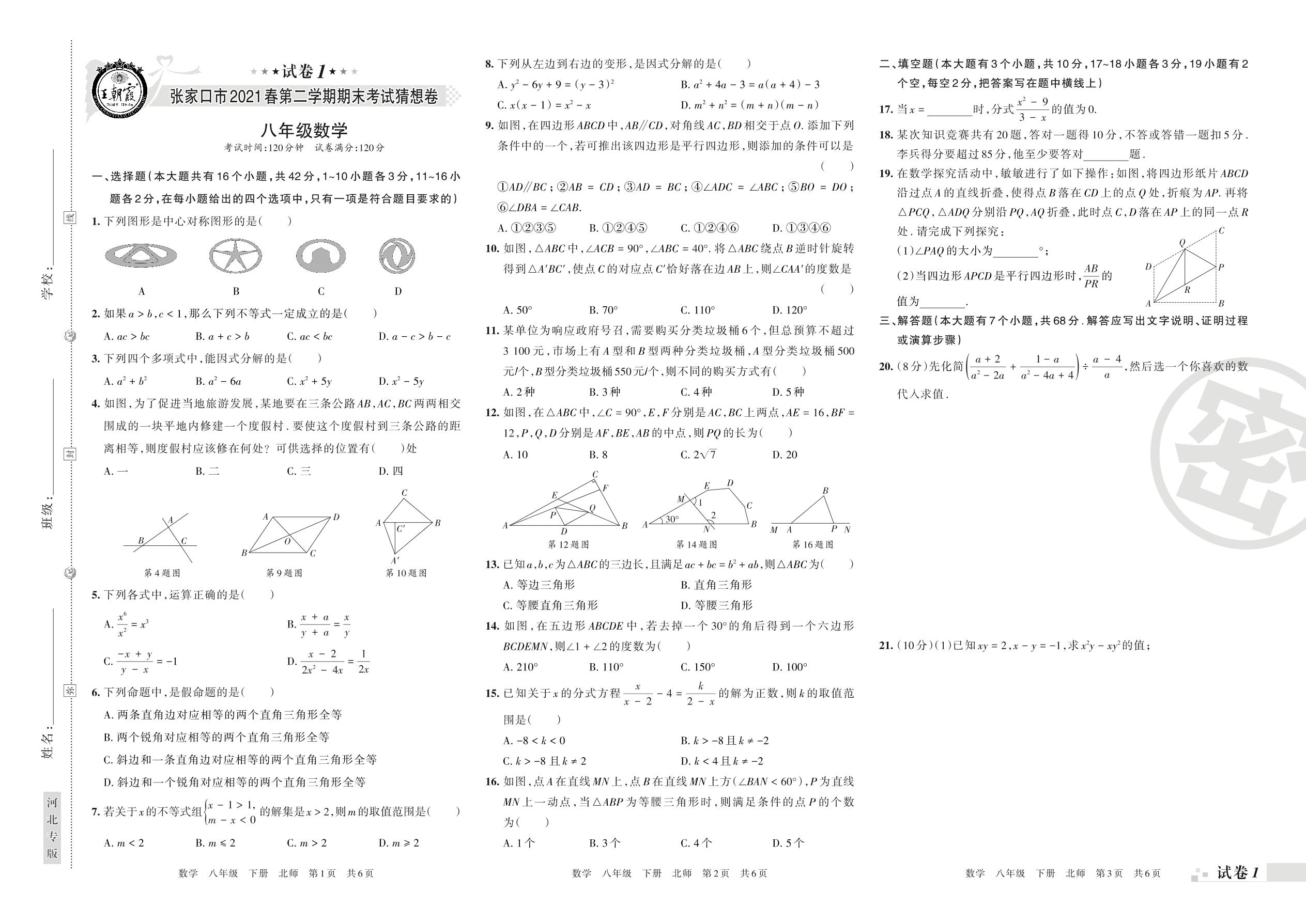 2019-2020学年第二学期张家口市期末猜想卷八年级数学试卷(北师版)【1】