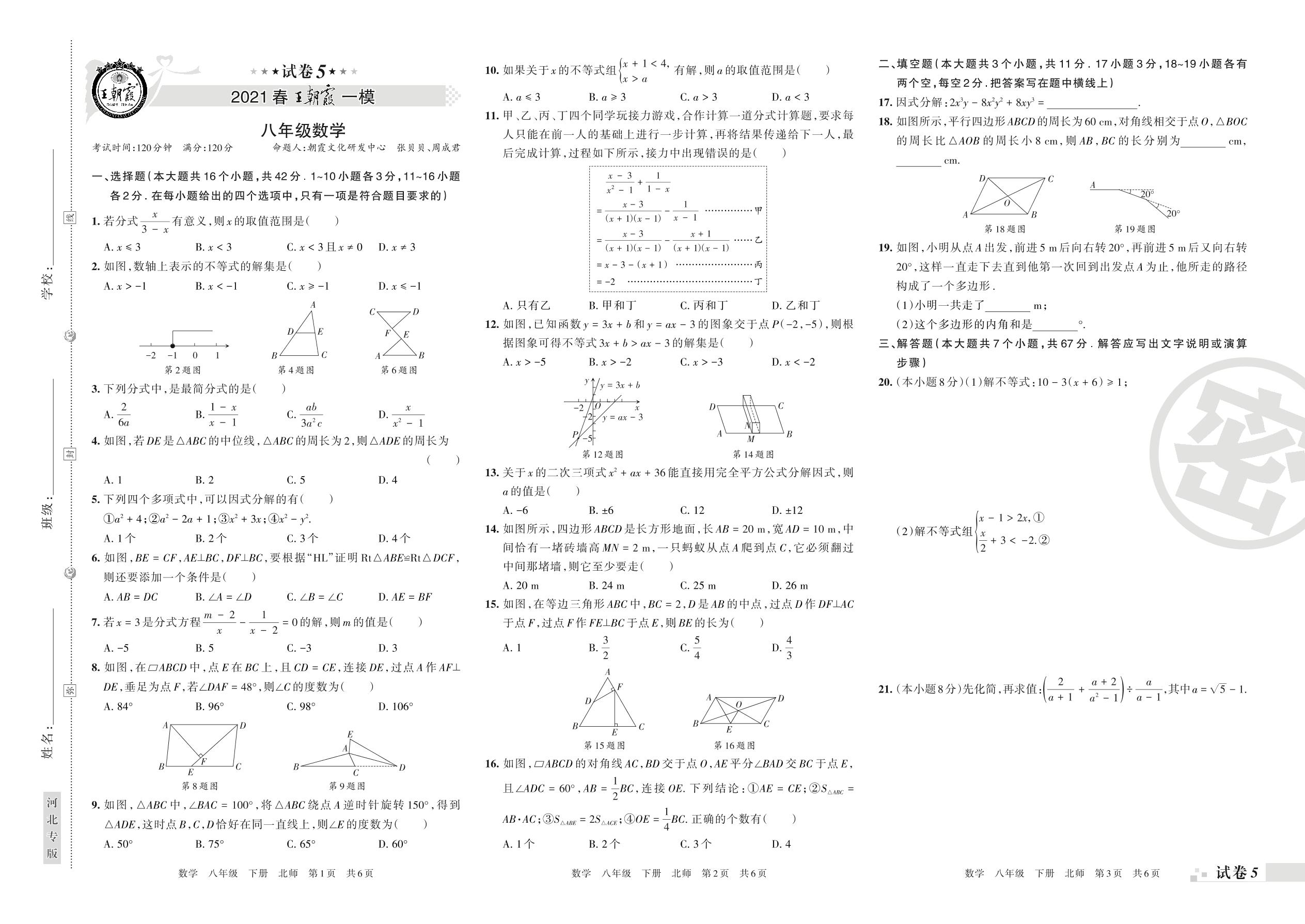 王朝霞期末模拟卷八年级下册数学(北师版)【5】