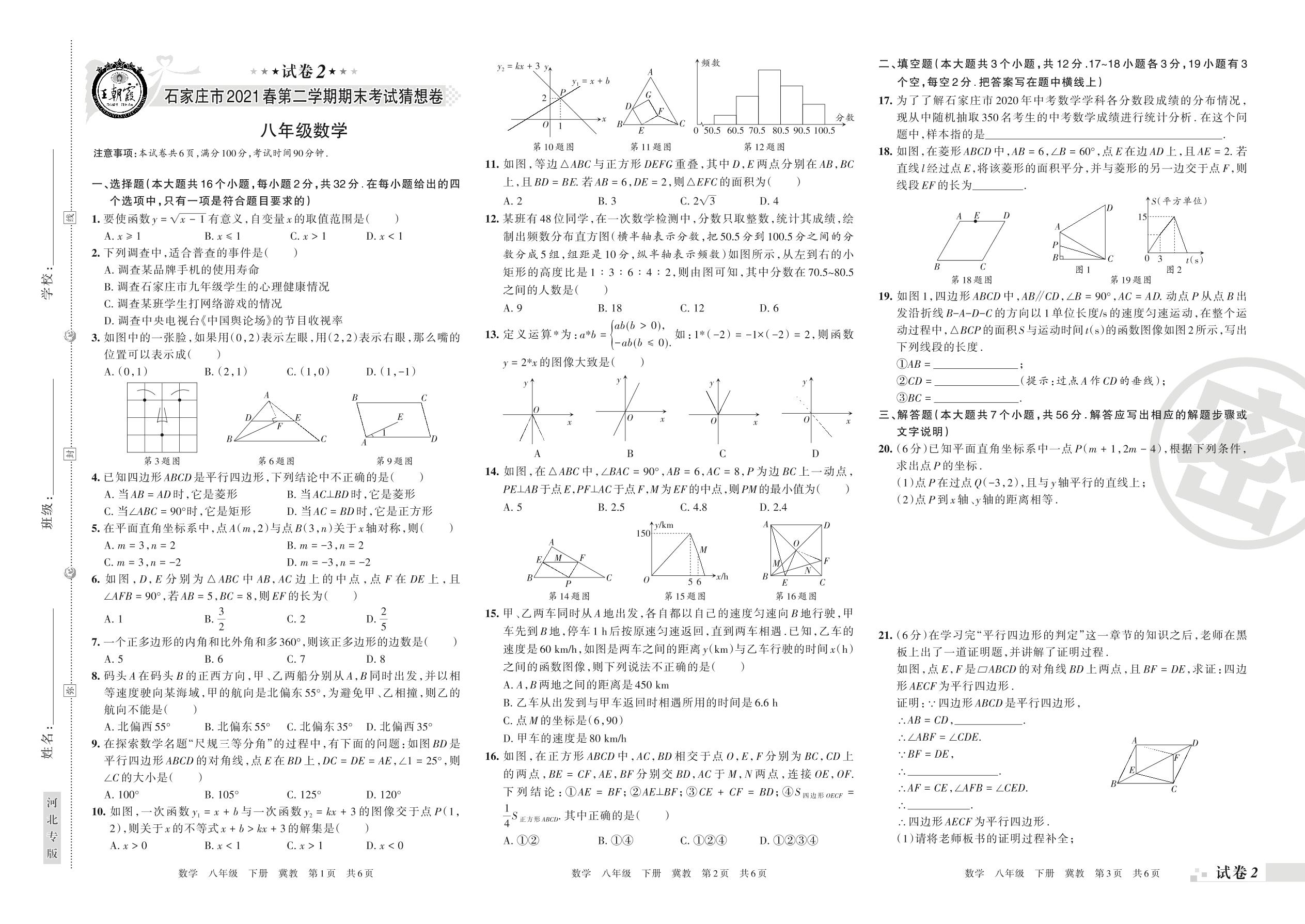 王朝霞期末猜想卷八年级下册数学(冀教版)【2】