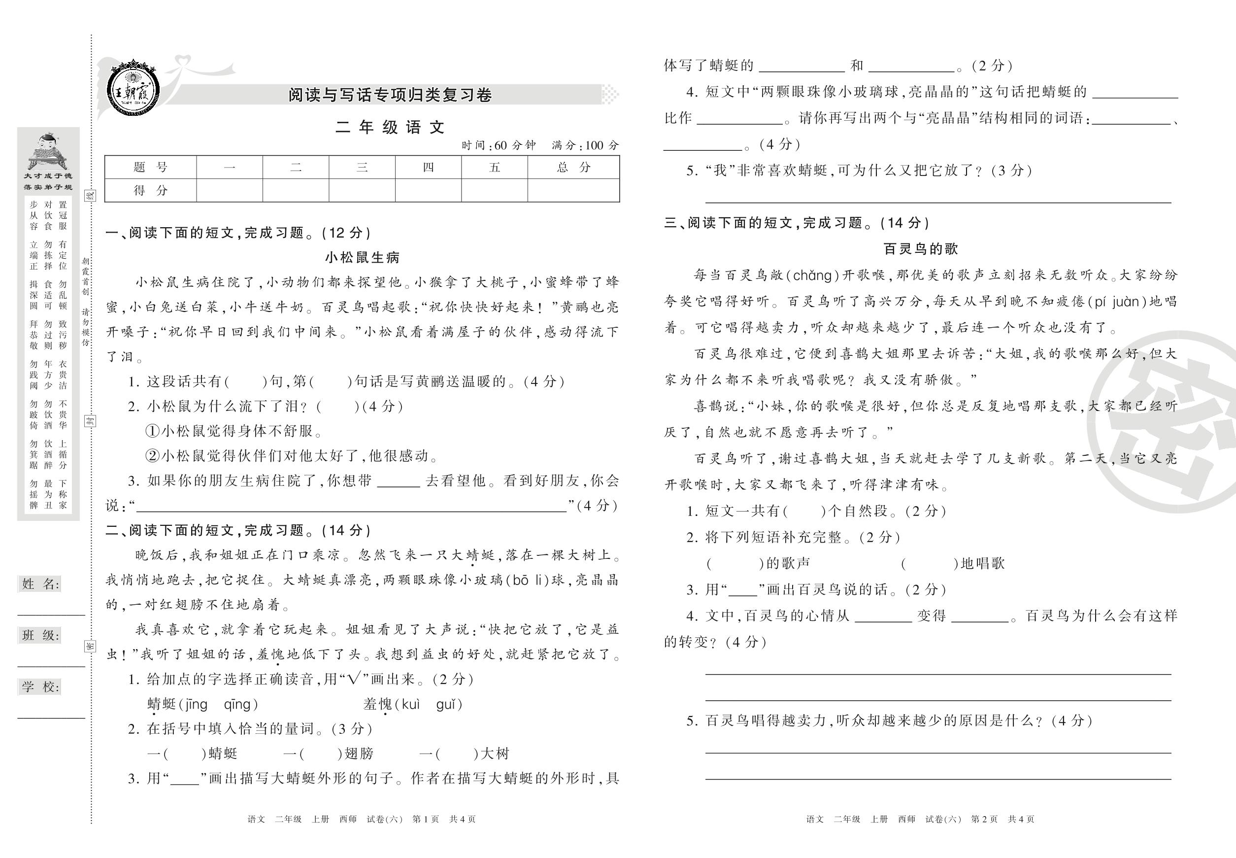 王朝霞期末专项卷二年级上册语文(西师版)_R21080174736【6】