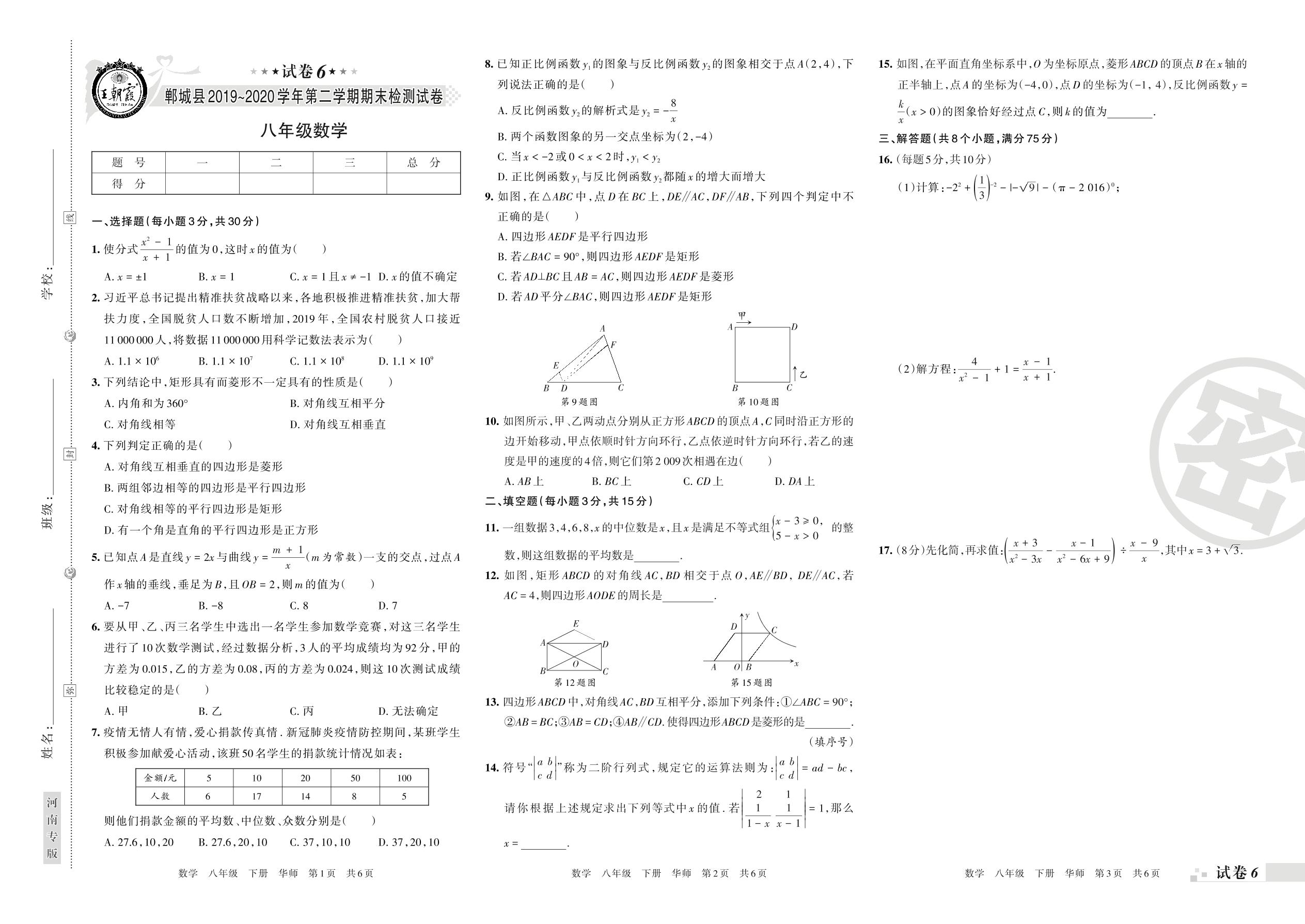 2019-2020学年第二学期周口市郸城县八年级数学试卷(华师版)【6】