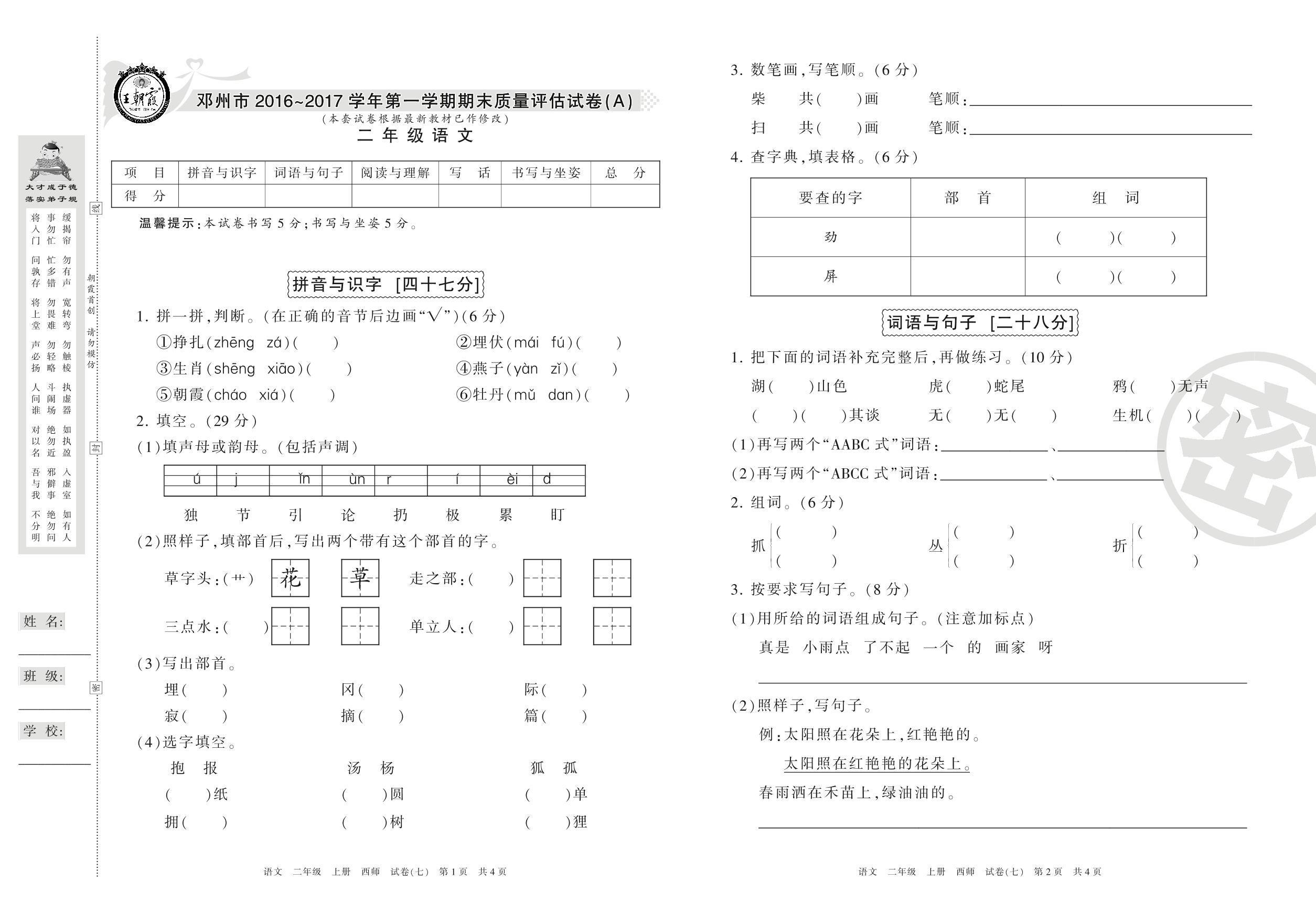 2016-2017学年第一学期邓州市二年级语文试卷(西师版)【7】