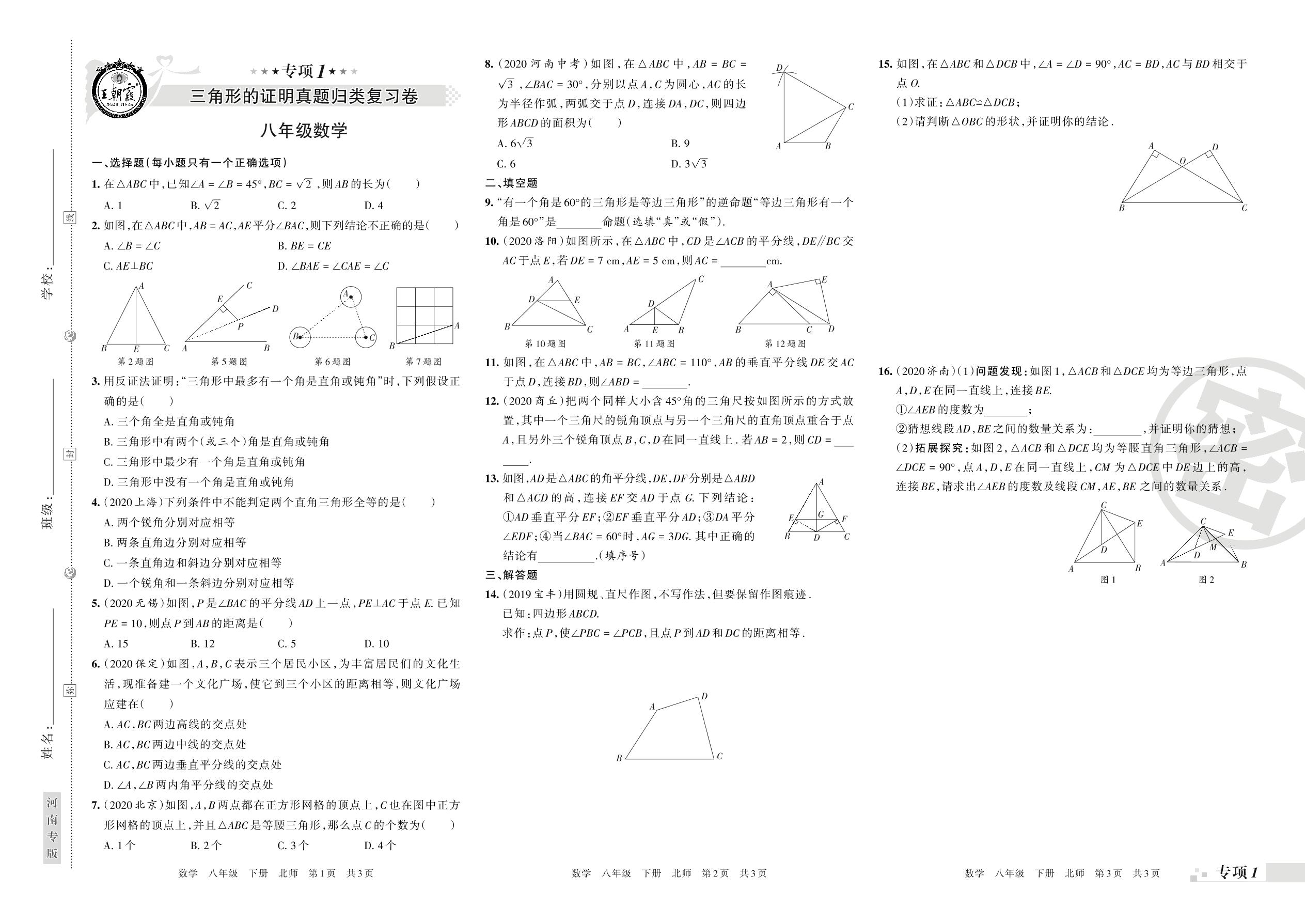 王朝霞期末专项卷——三角形的证明、一元一次不等式与一元一次不等式组的认识与解法八年级下册数学(北师版)【0】