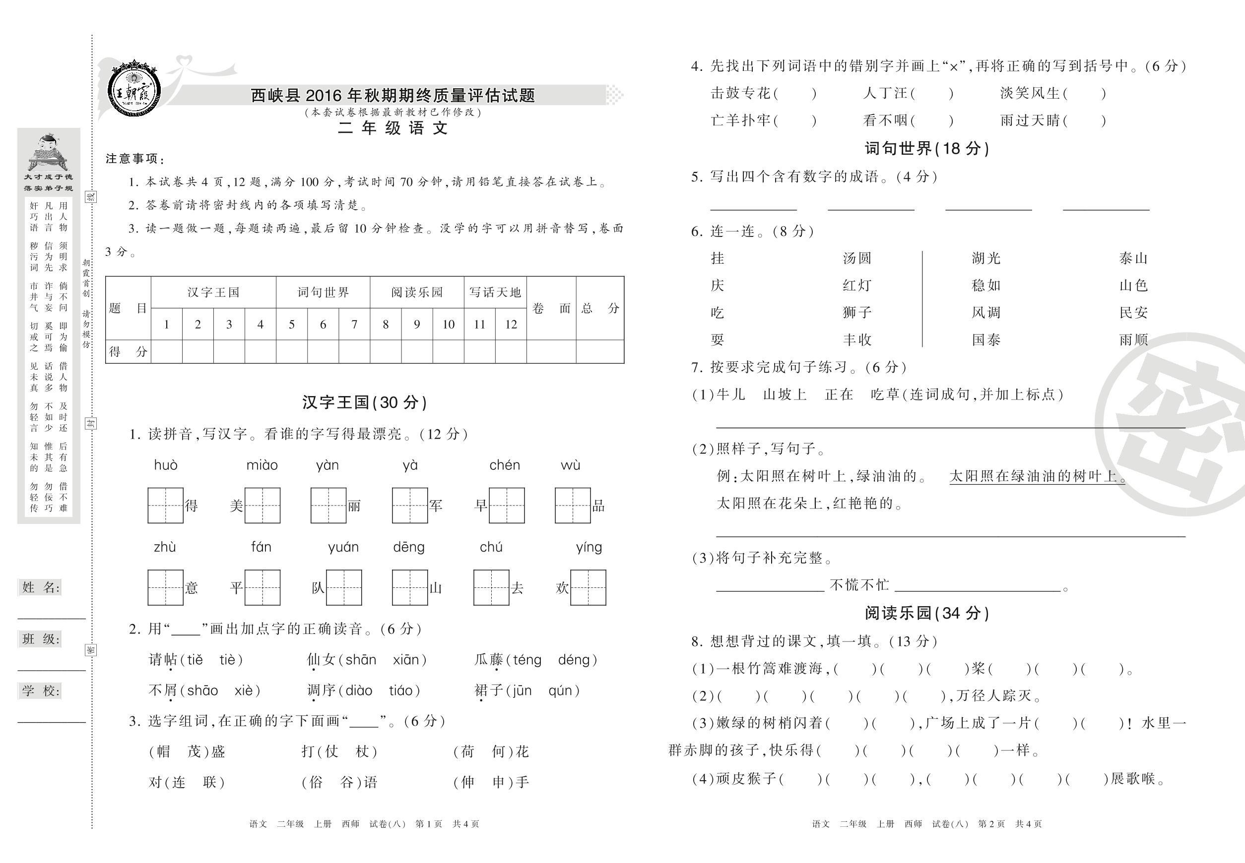 2016-2017学年第一学期南阳市西峡县二年级语文试卷(西师版)【8】