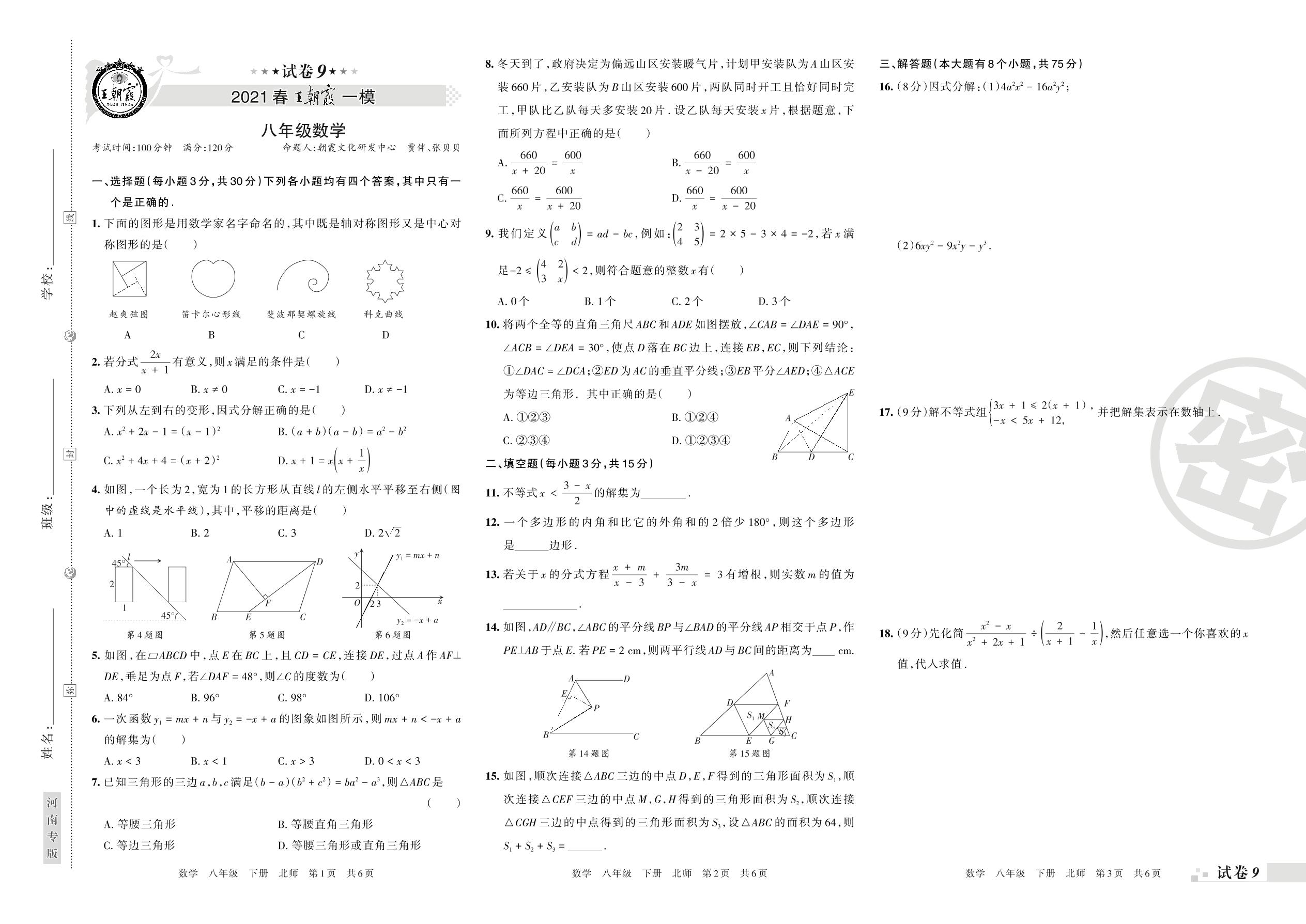 王朝霞期末模拟卷八年级下册数学(北师版)_R21080691047【9】
