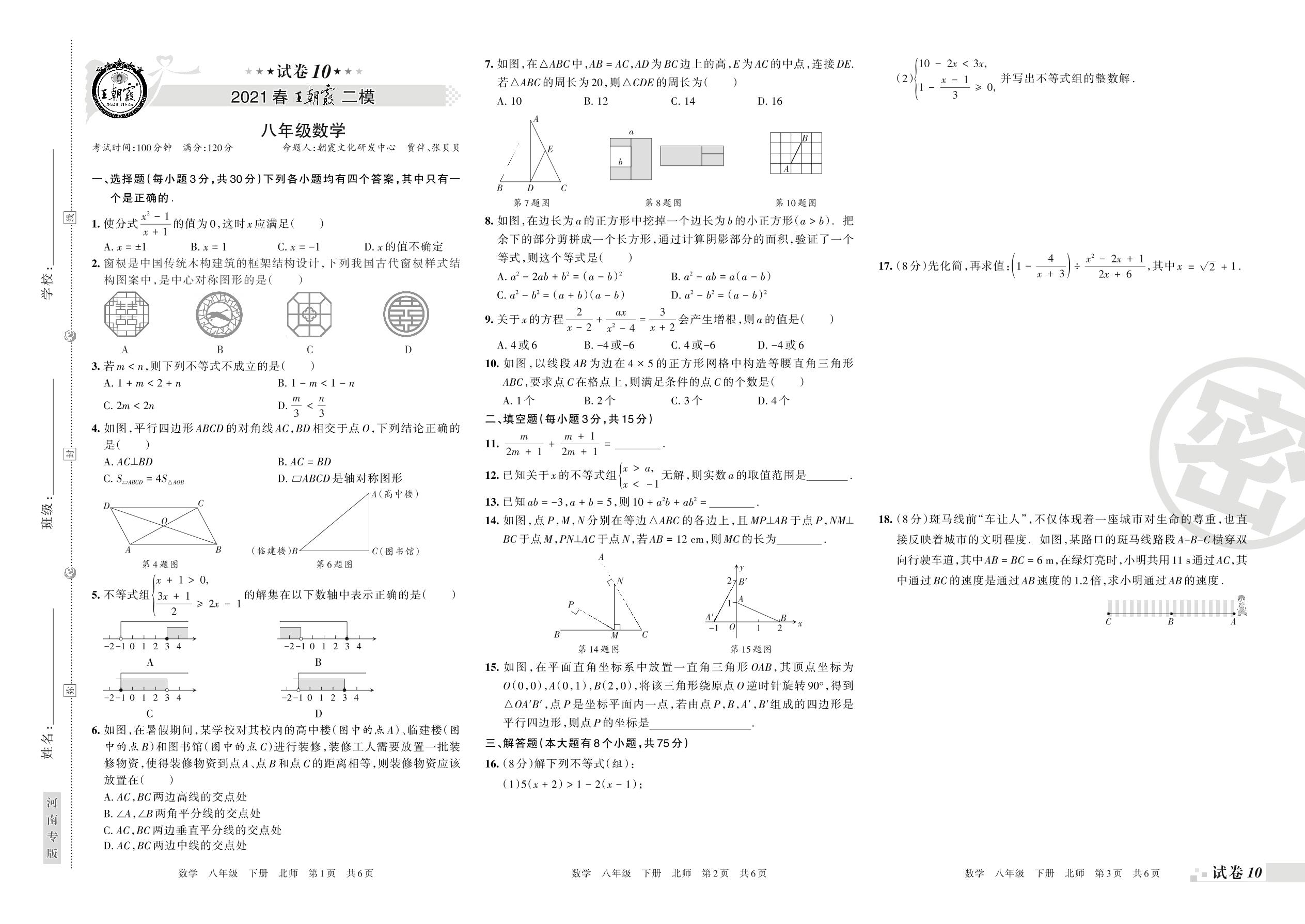 王朝霞期末模拟卷八年级下册数学(北师版)_R21080691053【10】