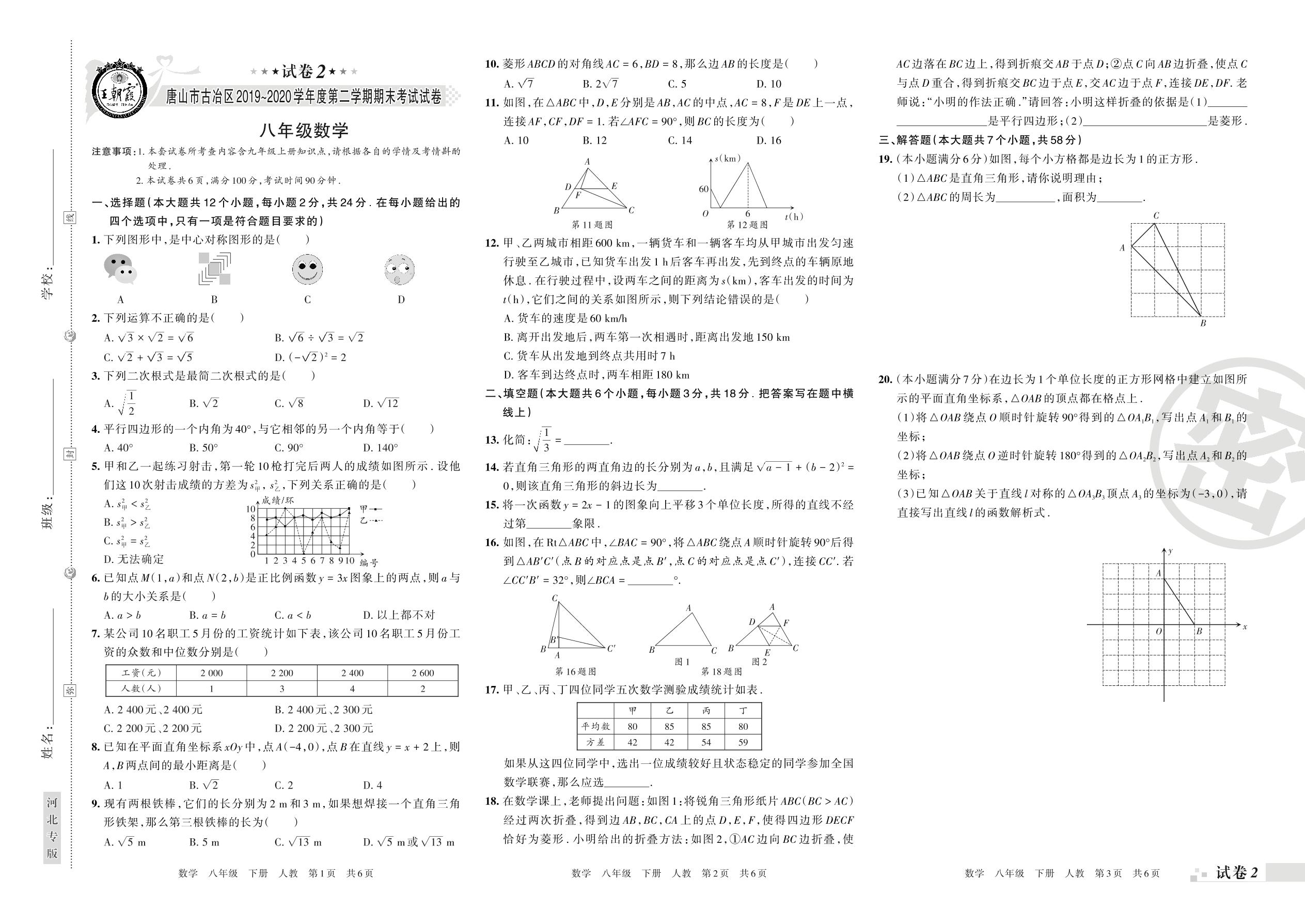 2019-2020学年第二学期唐山市古冶区八年级数学试卷(人教版)【2】