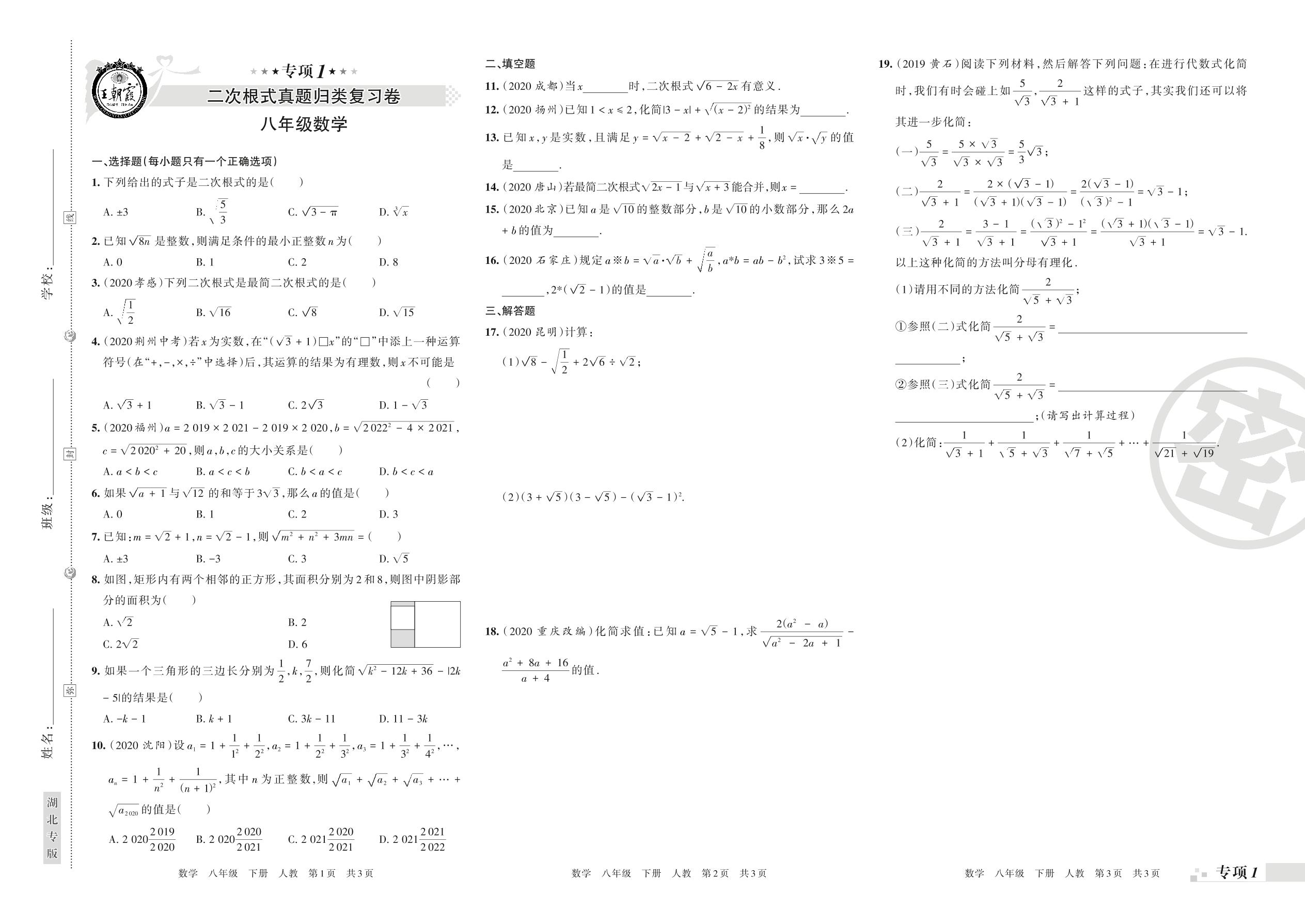 王朝霞期末专项卷——二次根式、勾股定理真题归类复习八年级下册数学(人教版)_R21080691420【0】