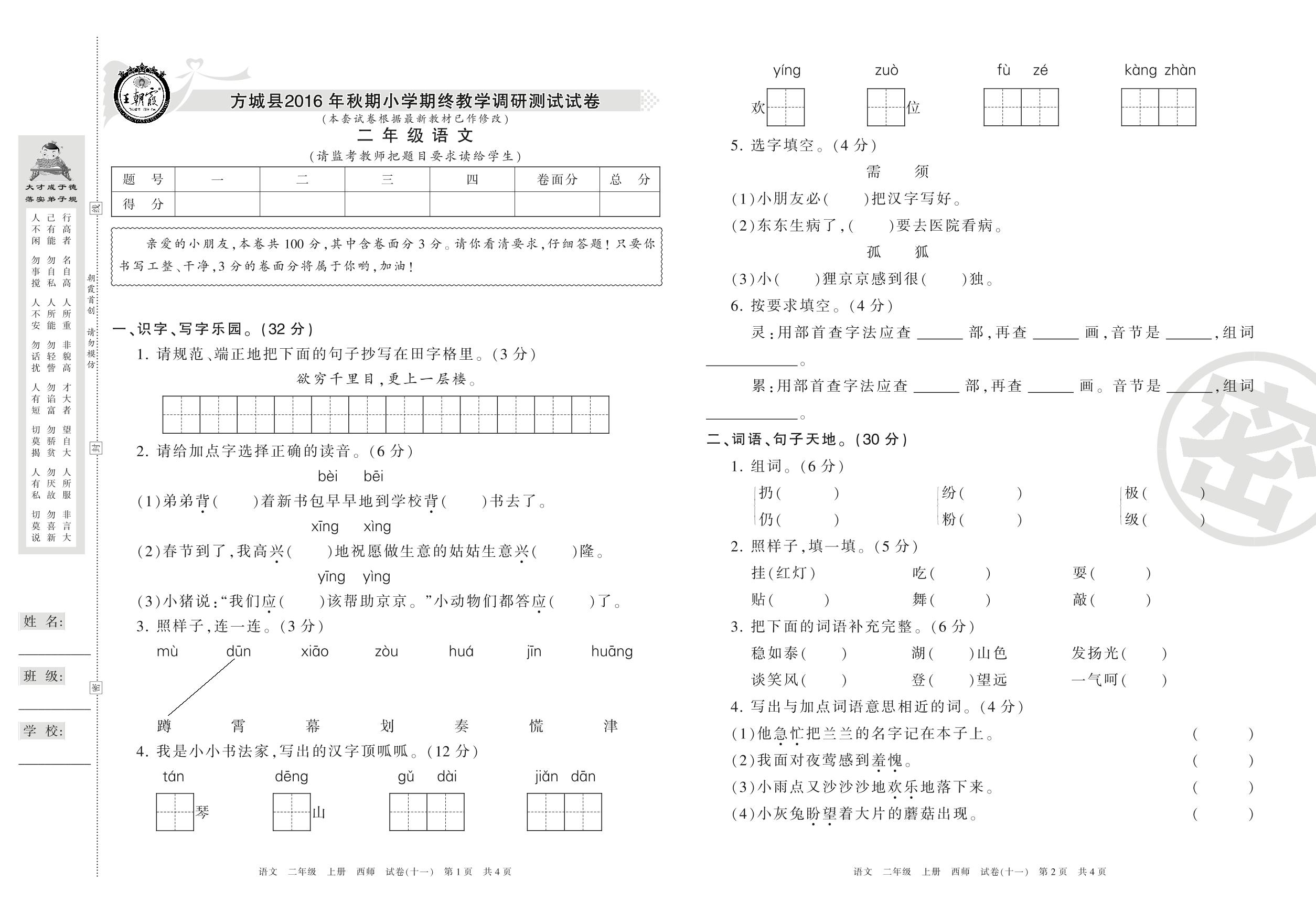 2016-2017学年第一学期南阳市方城县二年级语文试卷(西师版)【11】