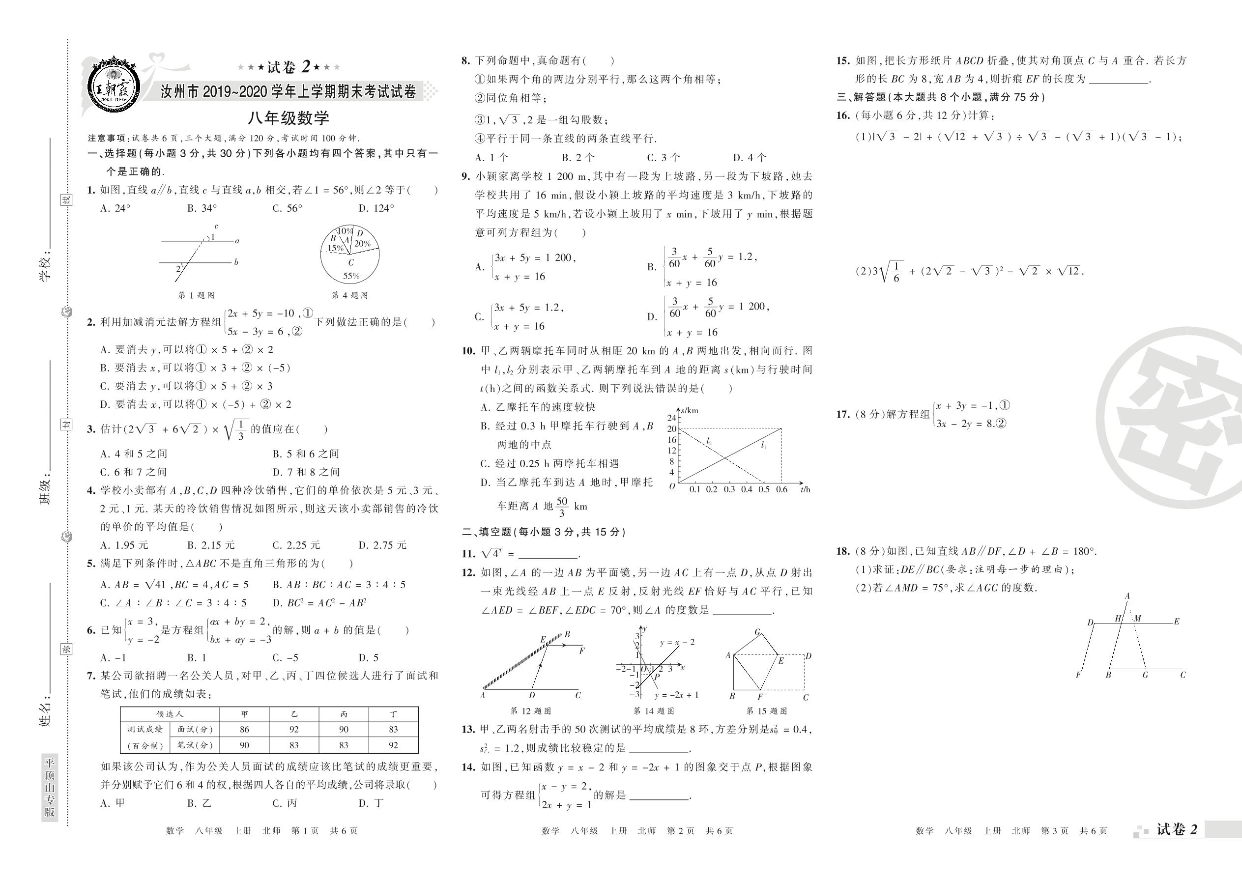 2019-2020学年第一学期汝州市八年级数学试卷(北师版)【2】