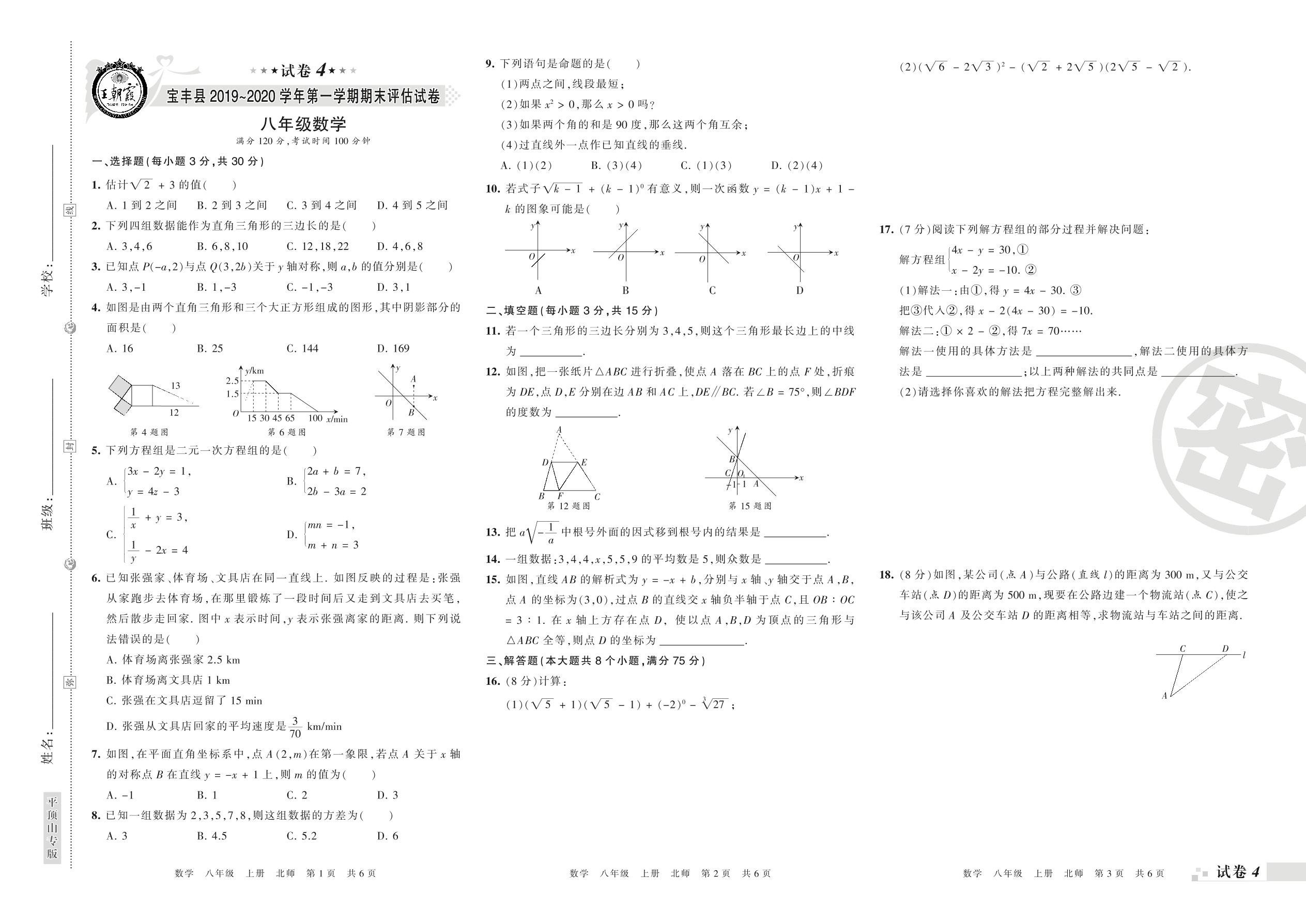2019-2020学年第一学期平顶山市宝丰县八年级数学试卷(北师版)【4】