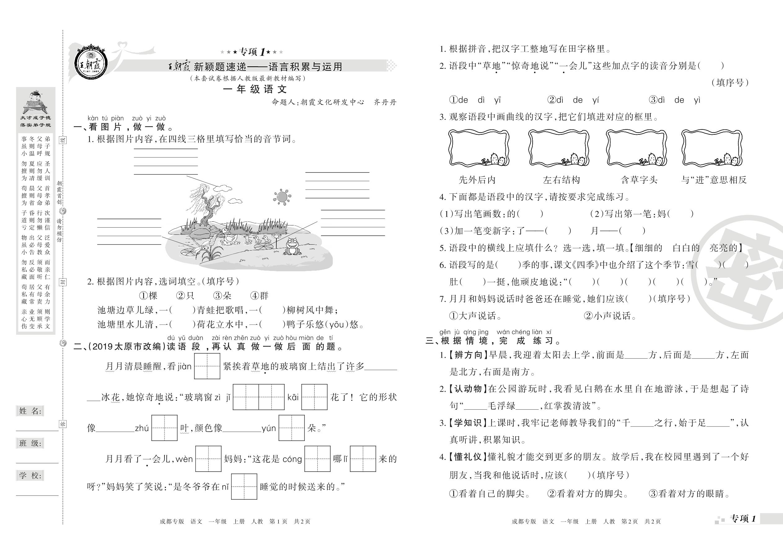 王朝霞期末专项卷——语言积累与运用、非连续性文本阅读一年级上册语文(人教版)_R210731174533【0】
