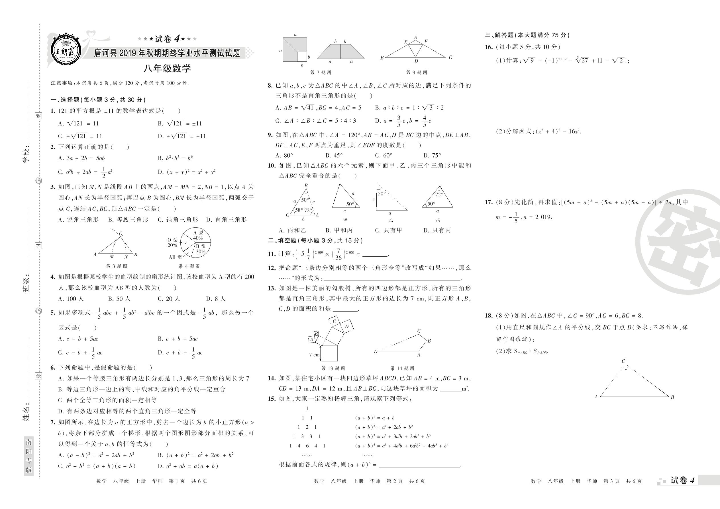 2019-2020学年第一学期南阳市唐河县八年级数学试卷(华师版)【4】