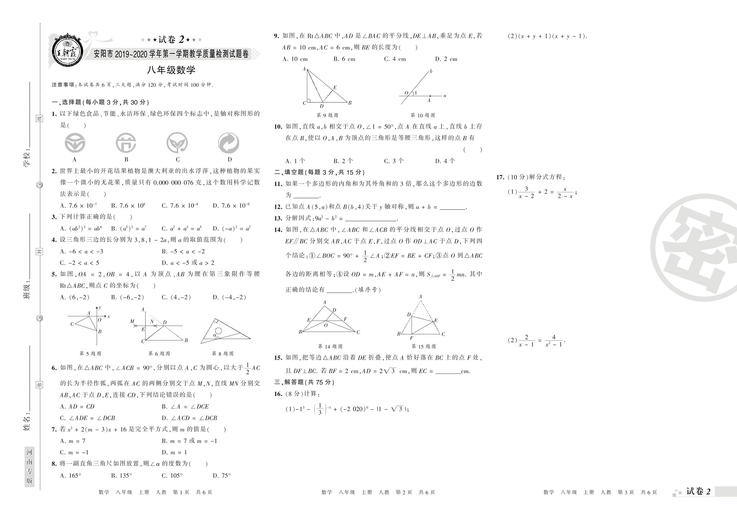2019-2020学年第一学期安阳市八年级数学试卷(人教版)【2】