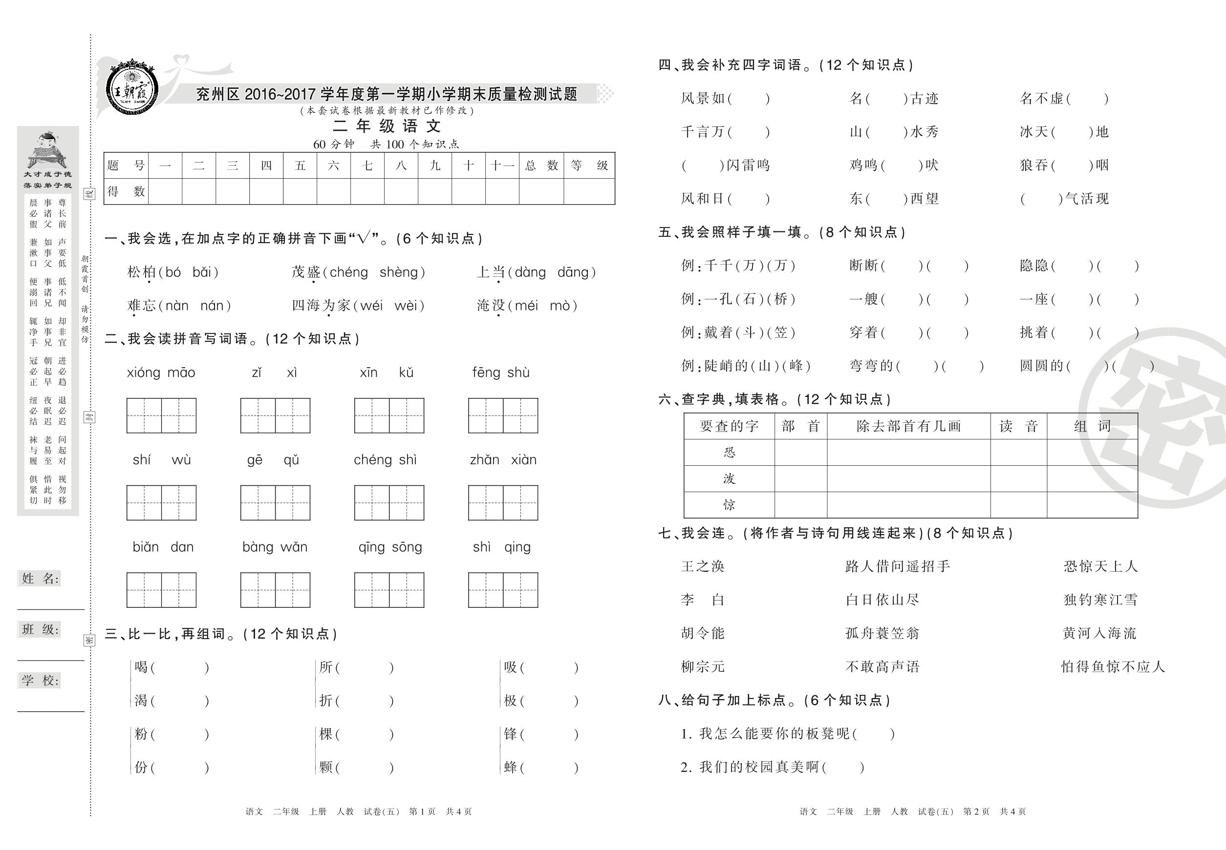 2016-2017学年第一学期济宁市兖州区二年级语文试卷(人教版)【5】