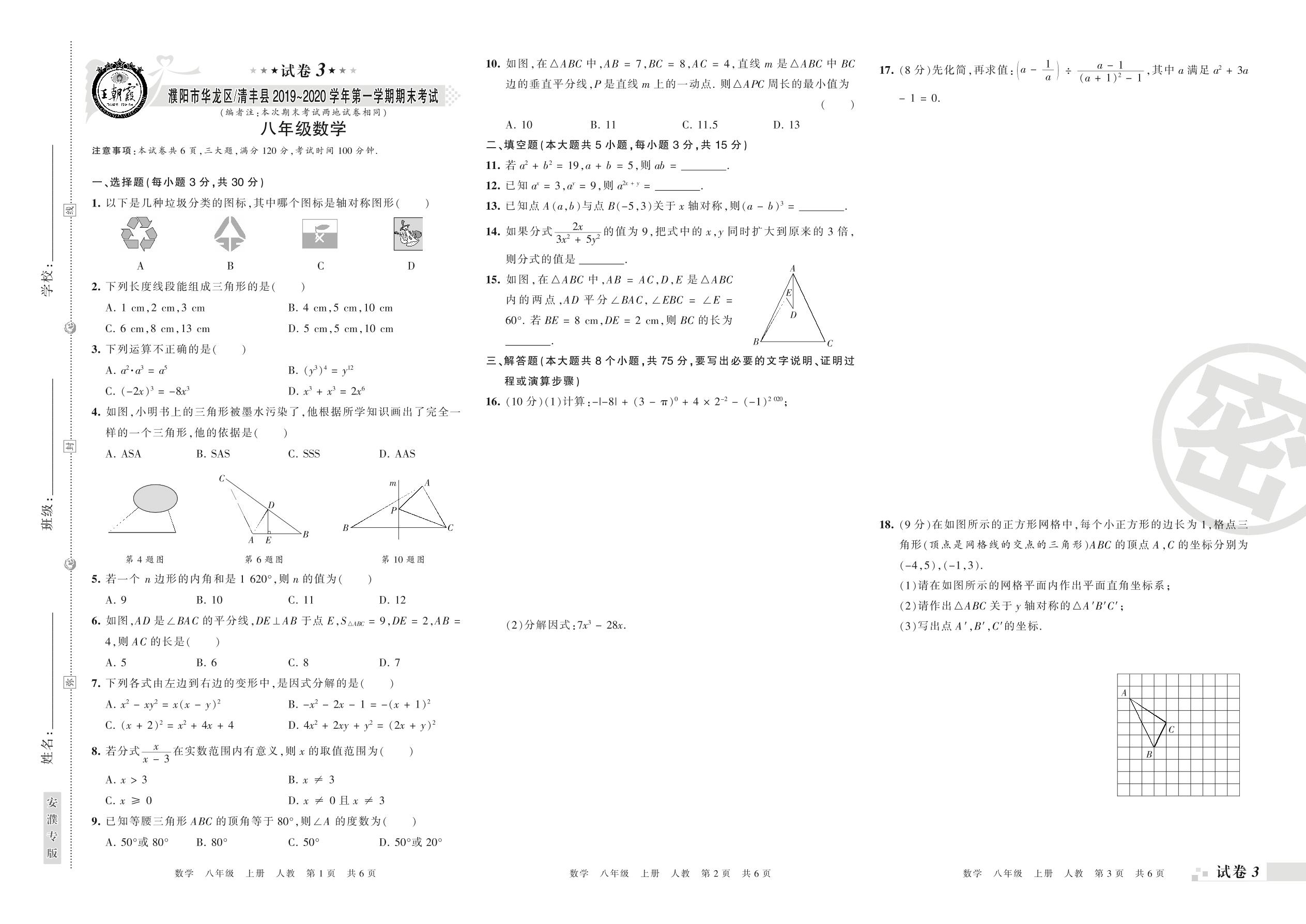 2019-2020学年第一学期濮阳市华龙区、清丰县八年级数学试卷(人教版)【3】