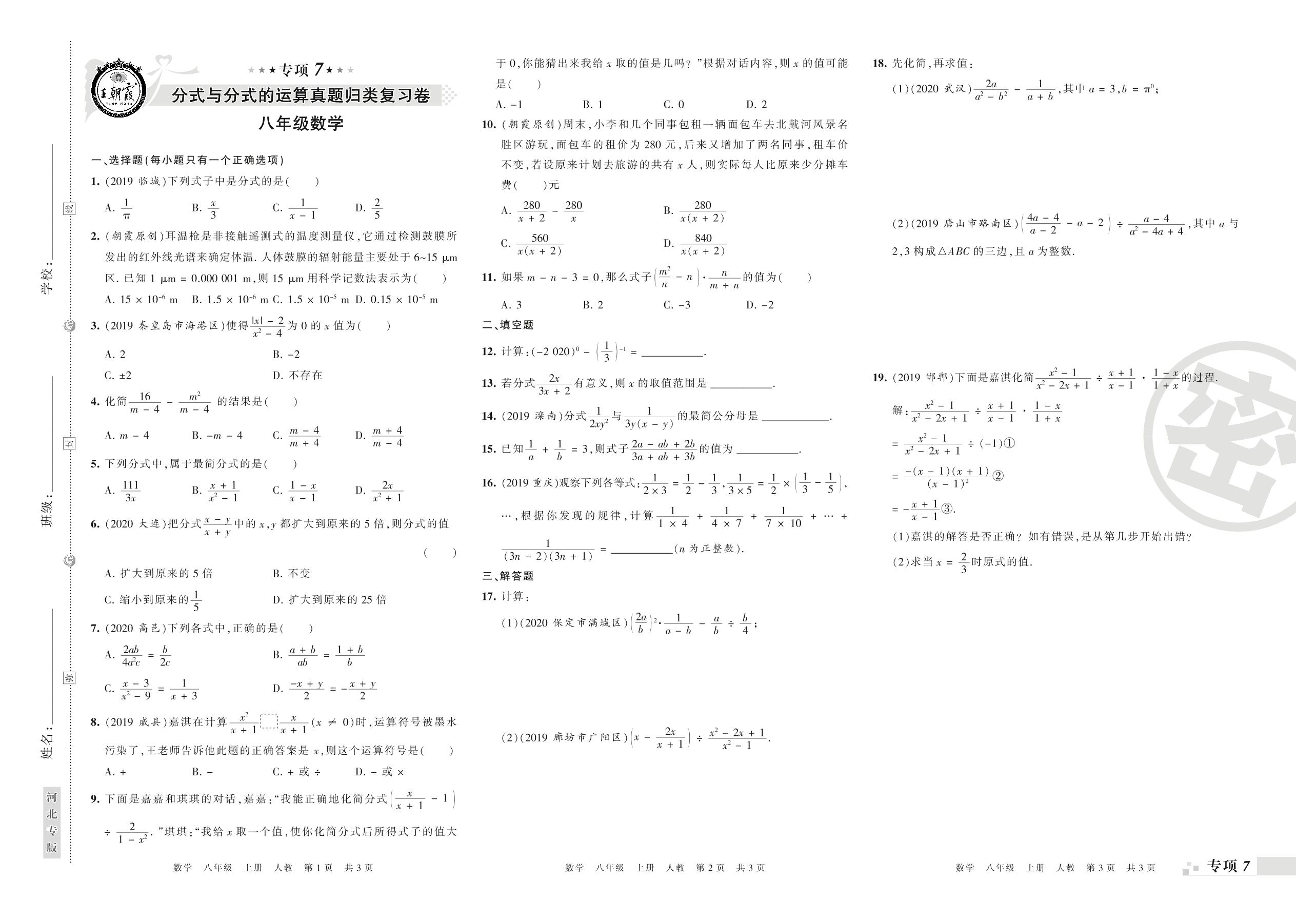 王朝霞期末专项卷——分式与分式的运算、分式方程及其应用真题归类复习八年级上册数学(人教版)【0】