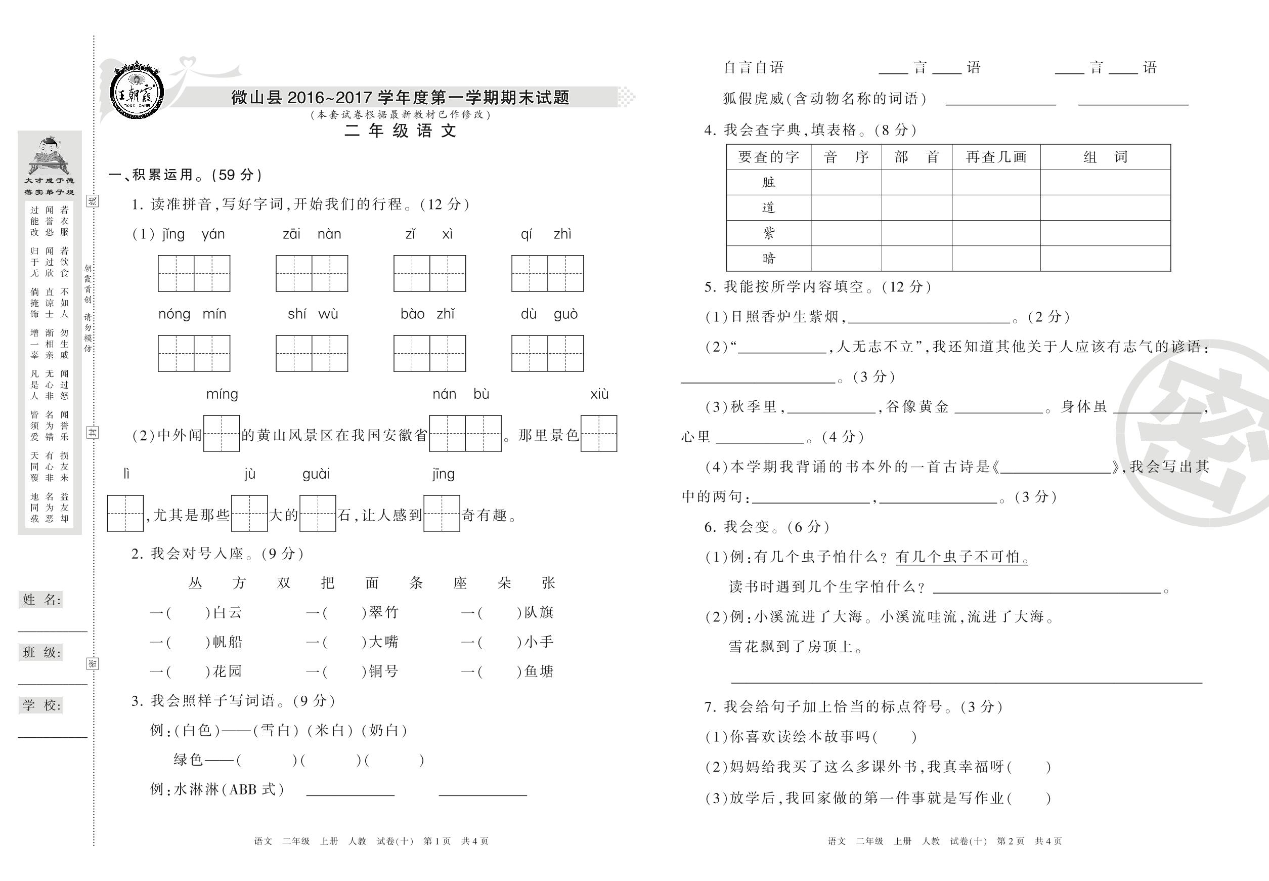2016-2017学年第一学期济宁市微山县二年级语文试卷(人教版)【10】